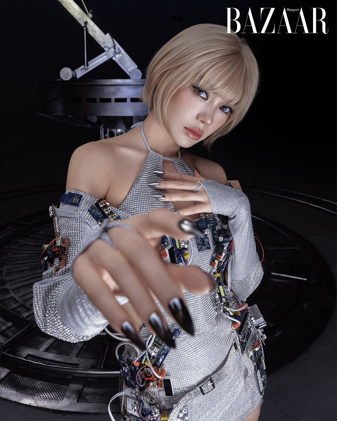 Sáng tạo đột phá nhất phải kể đến chiếc váy ngắn sequin ánh bạc đính vi mạch bán dẫn – biểu tượng của sự giải phóng và tỏa sáng sau khi vượt qua giới hạn.