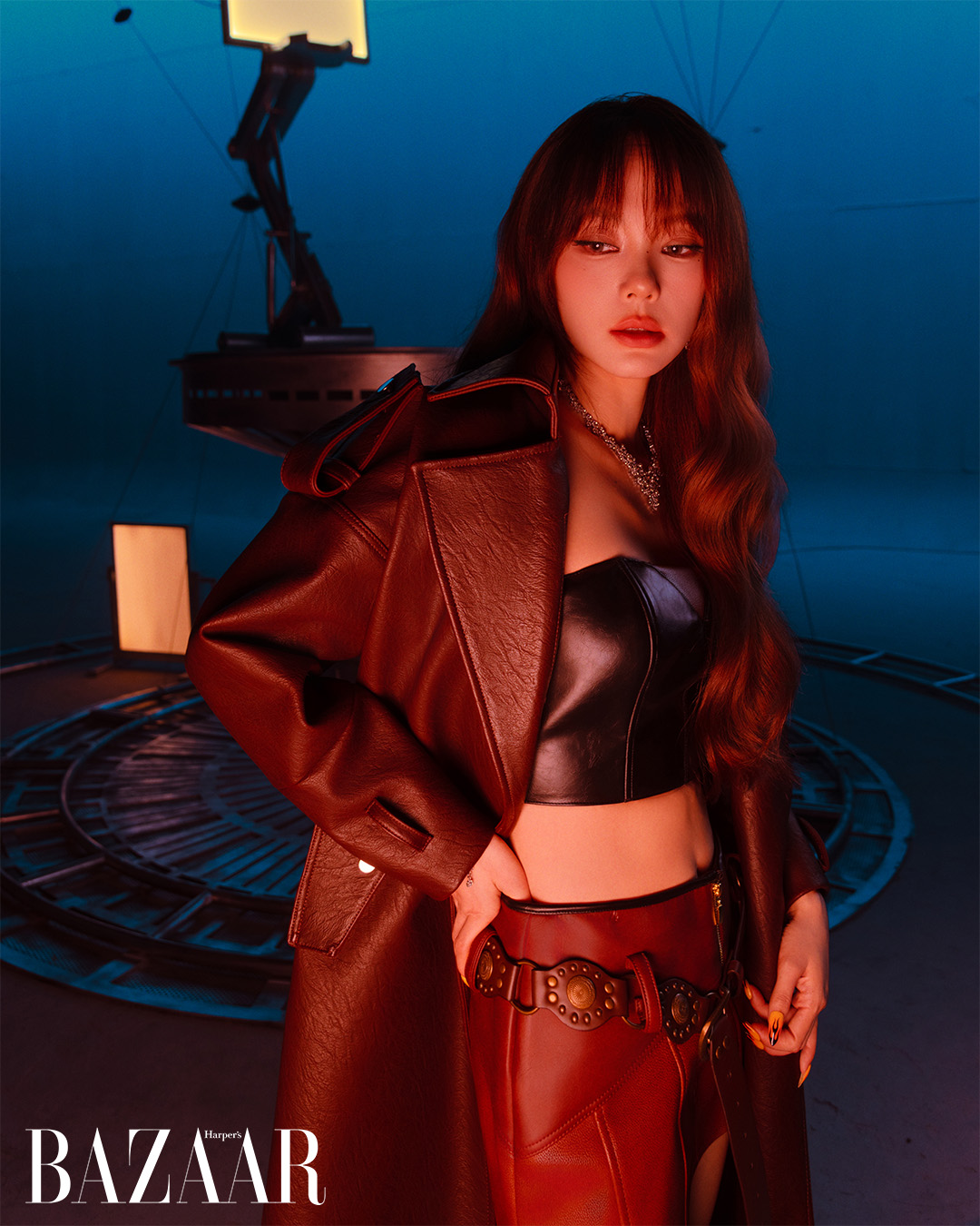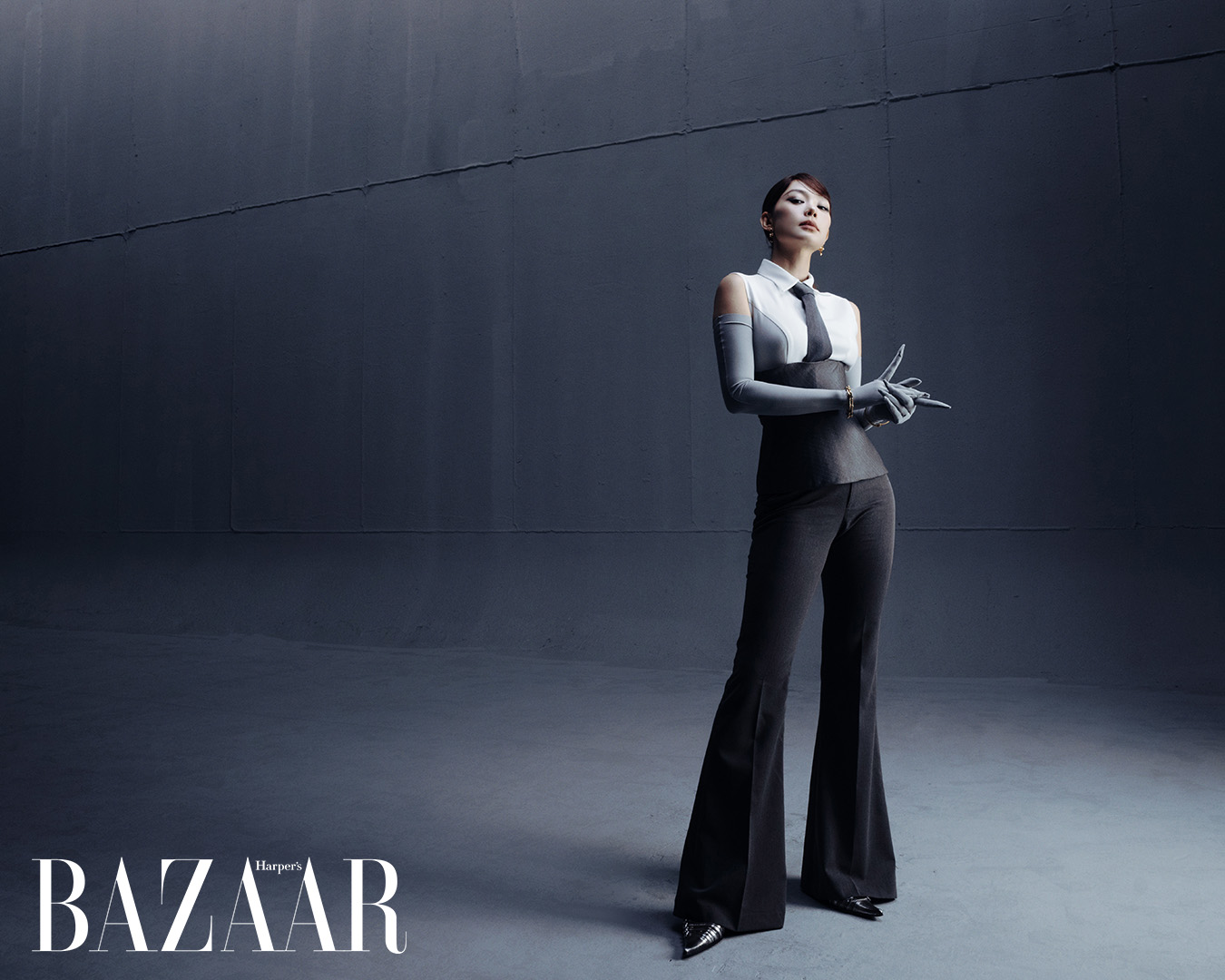 Ở hình tượng lãnh đạo quyết đoán, Minh Hằng mặc corset phối quần tây cùng găng tay đỏ và trang sức Tiffany & Co., biểu trưng cho quyền lực và sự tự tin.