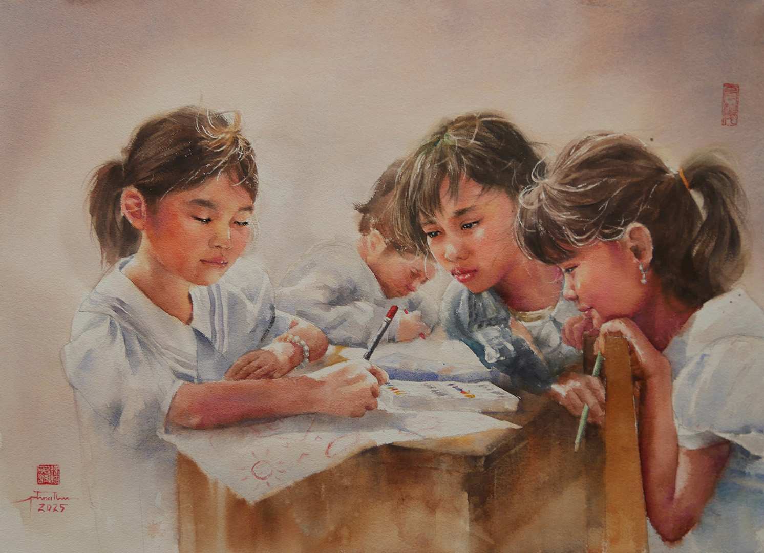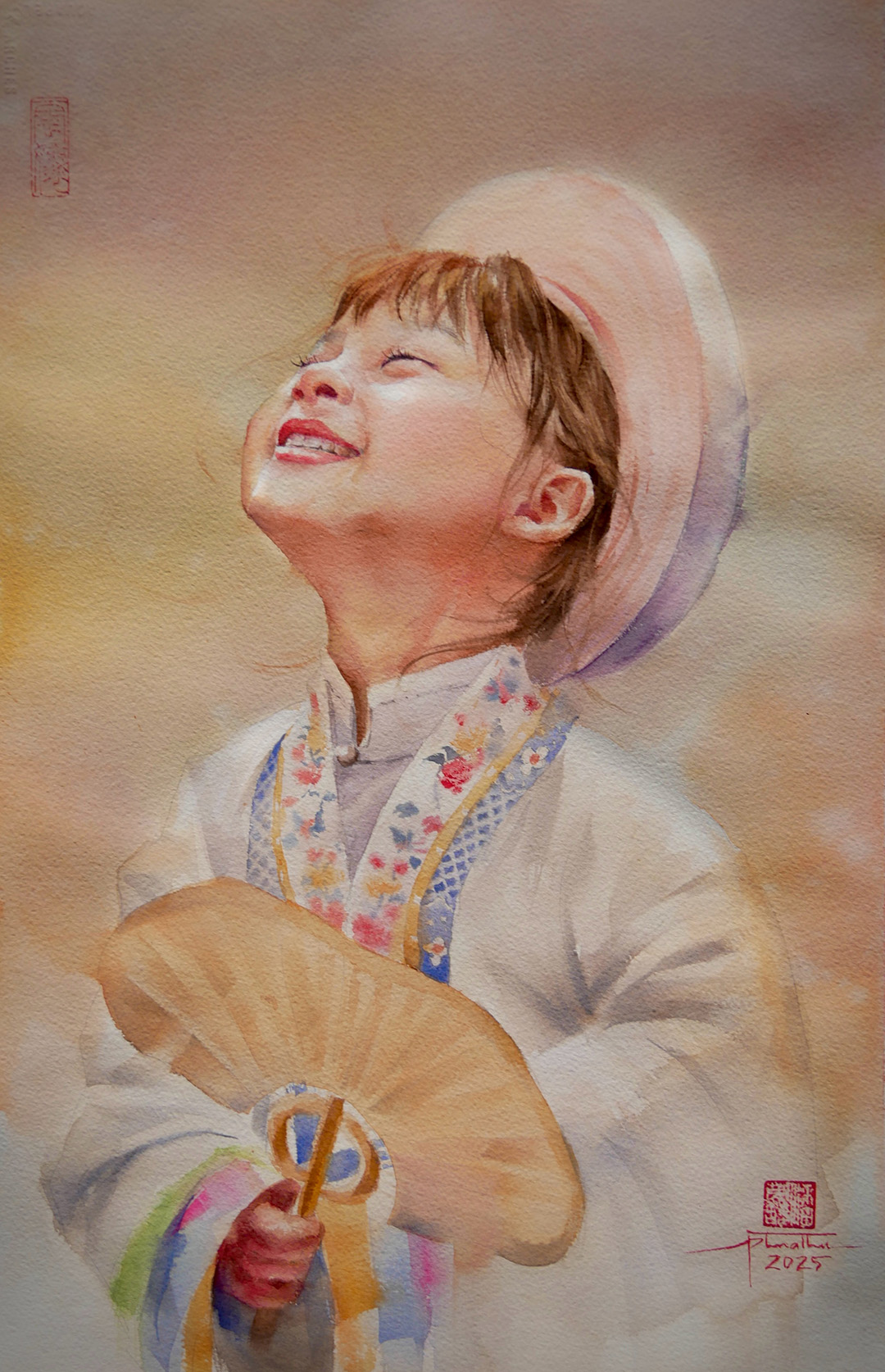 Chất liệu màu nước khó kiểm soát, đòi hỏi sự tiết chế và chấp nhận tính ngẫu nhiên – trở thành lựa chọn gắn bó lâu dài của Phan Anh Thư không phải ngẫu nhiên. Màu nước là chất liệu đầu tiên cô chọn đối diện, cũng là nỗi sợ lớn nhất khi mới bước vào hội hoạ. Nhưng chính sự mong manh, nhẹ nhàng mà nội lực ấy lại phản chiếu đúng tinh thần sống mà Thư theo đuổi: mềm mại nhưng không yếu đuối, lặng lẽ mà bền bỉ.