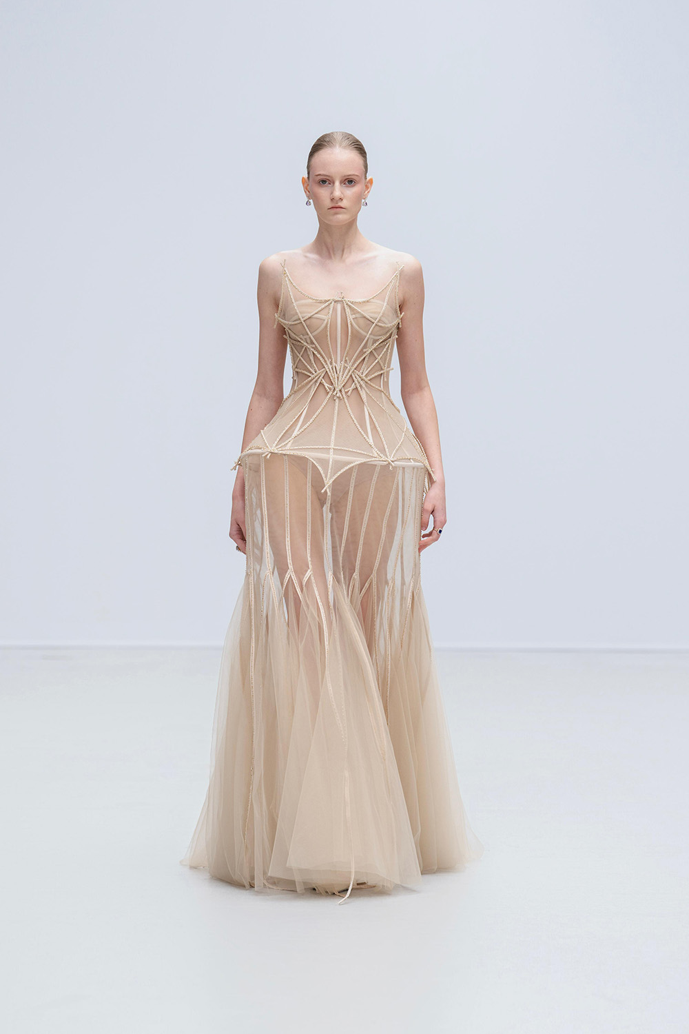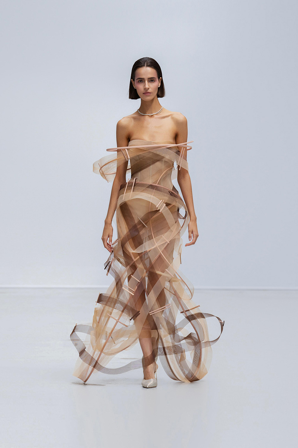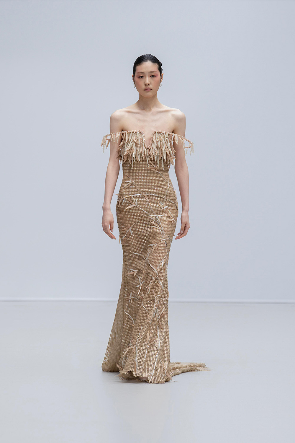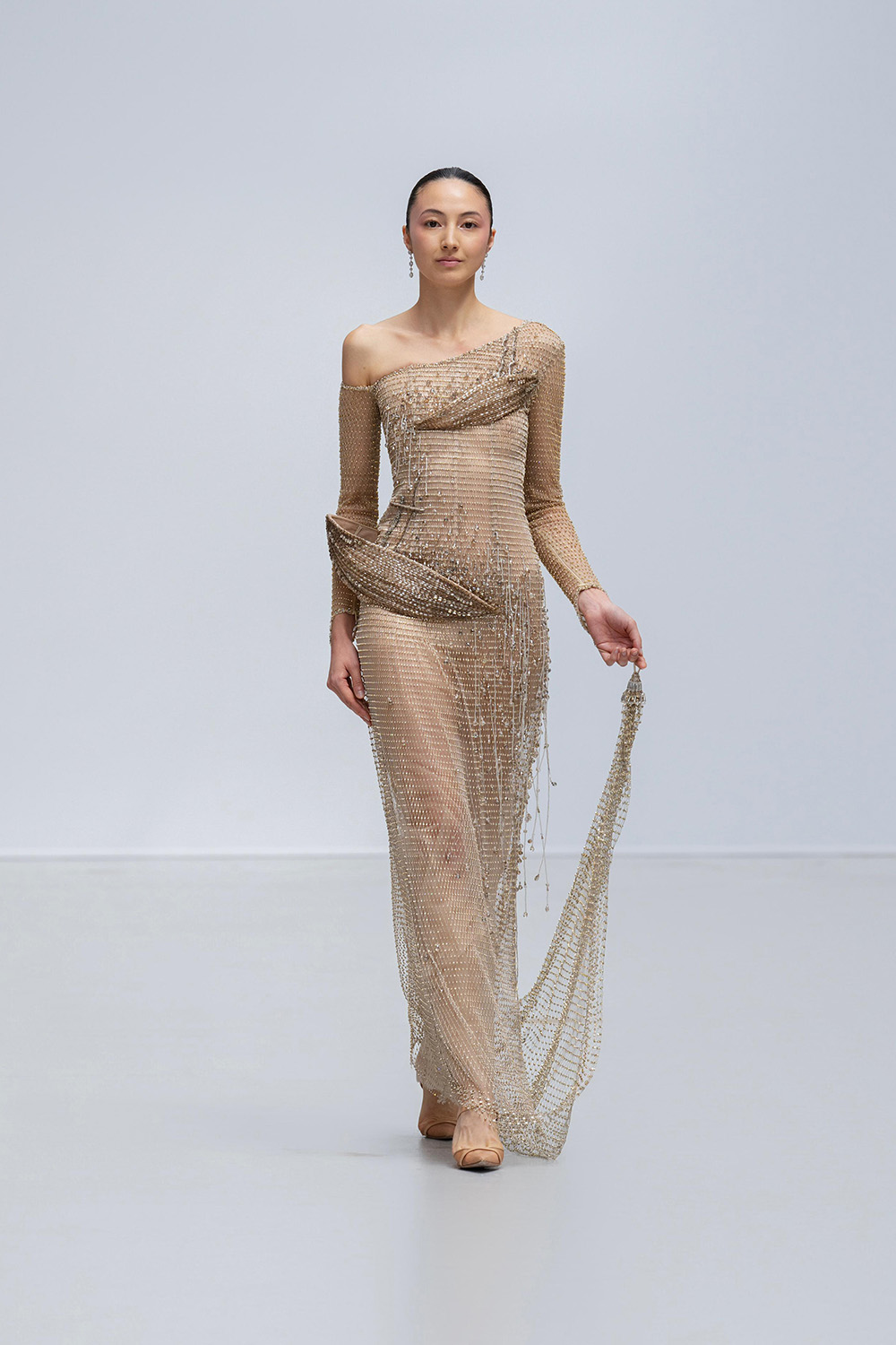 Bộ sưu tập Haute Couture Thu Đông 2025 tiếp tục khai thác kỹ thuật làm nên tên tuổi của Phan Huy – lưới đàn hồi xử lý chuyển màu, tạo hiệu ứng ánh sáng tinh tế và chuyển động mềm mại theo từng bước đi.