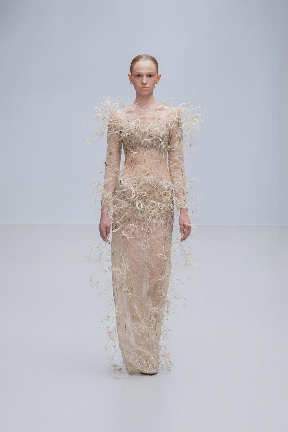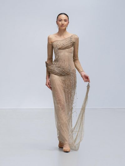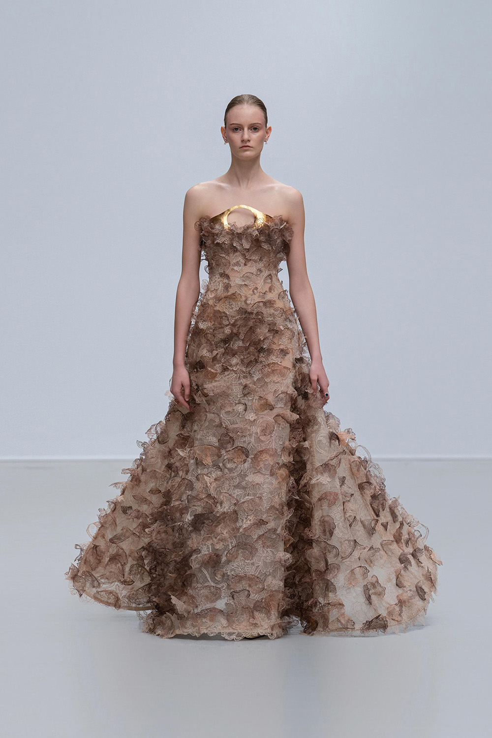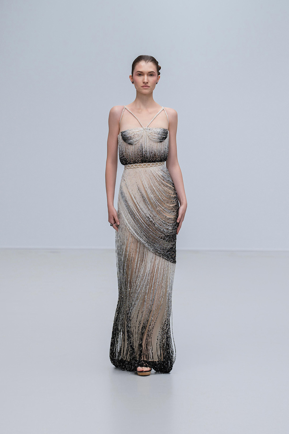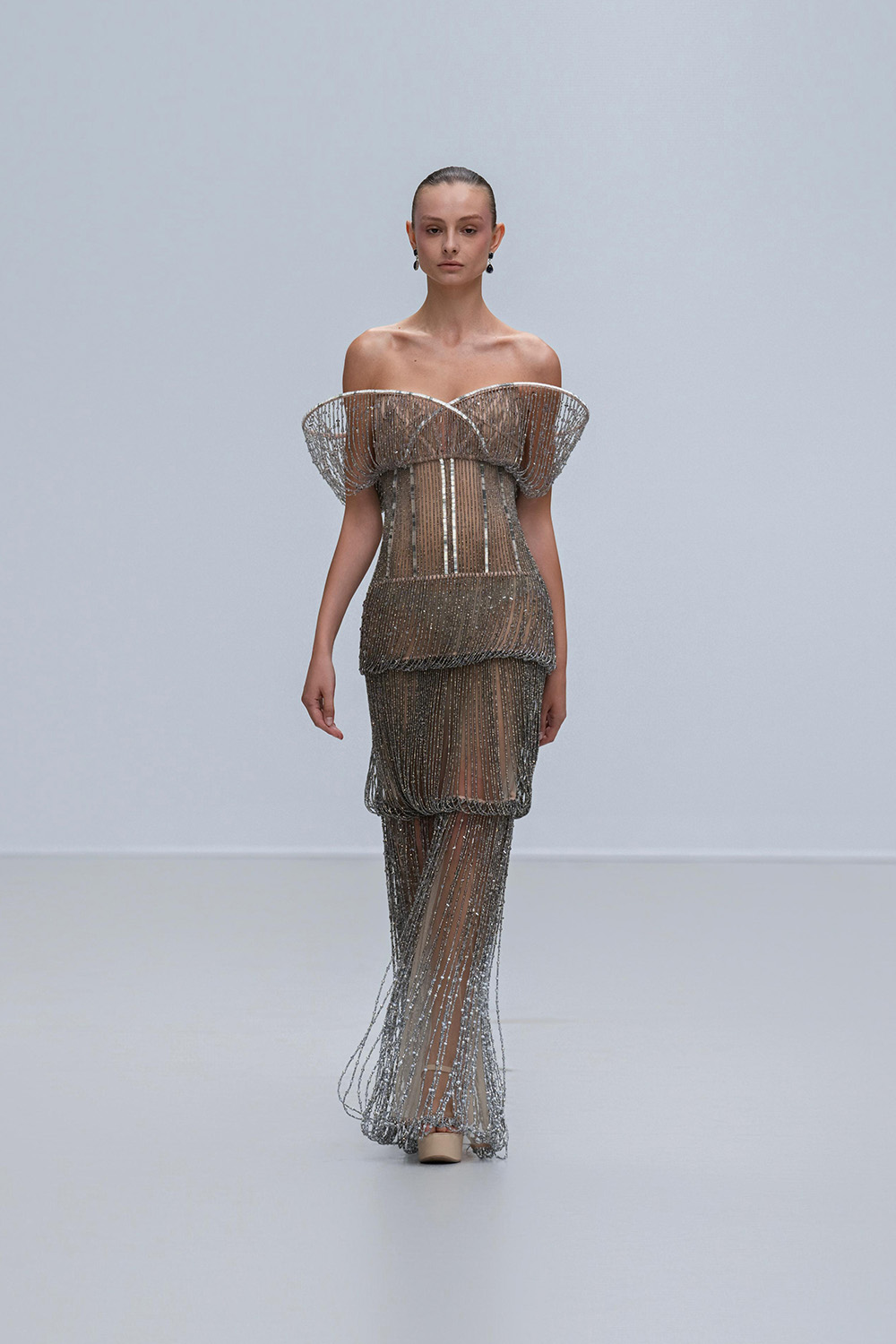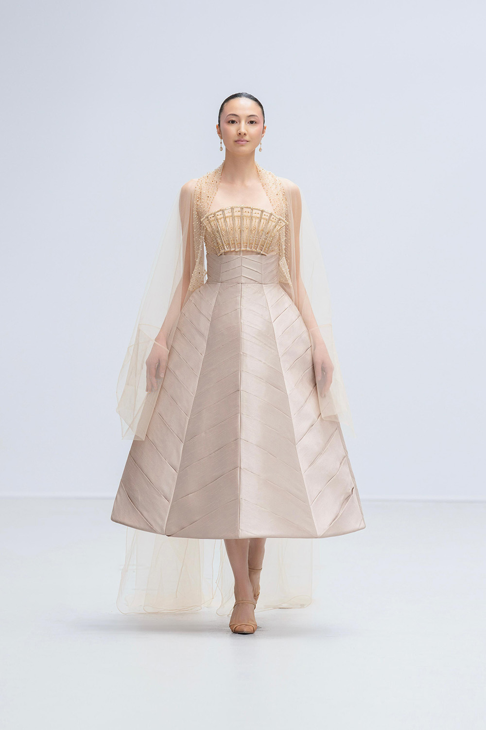 Bộ sưu tập Haute Couture Thu Đông 2025 tiếp tục khai thác kỹ thuật làm nên tên tuổi của Phan Huy – lưới đàn hồi xử lý chuyển màu, tạo hiệu ứng ánh sáng tinh tế và chuyển động mềm mại theo từng bước đi.
