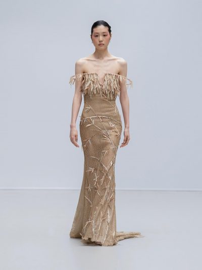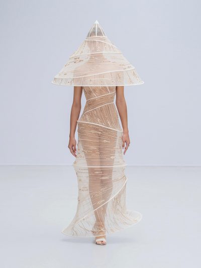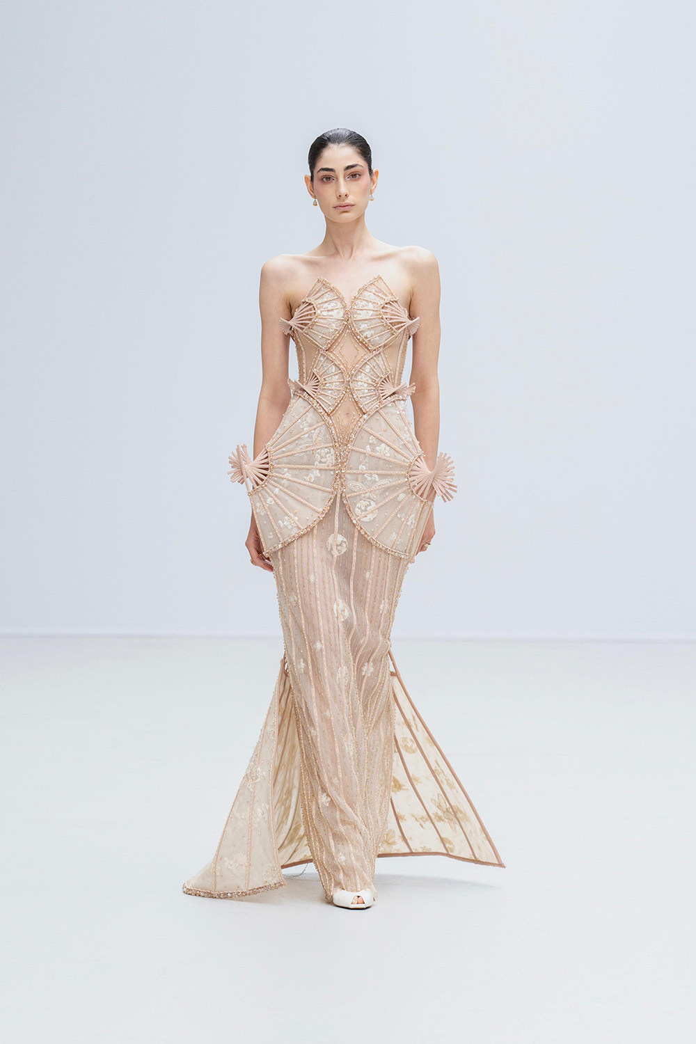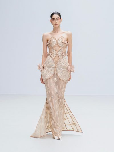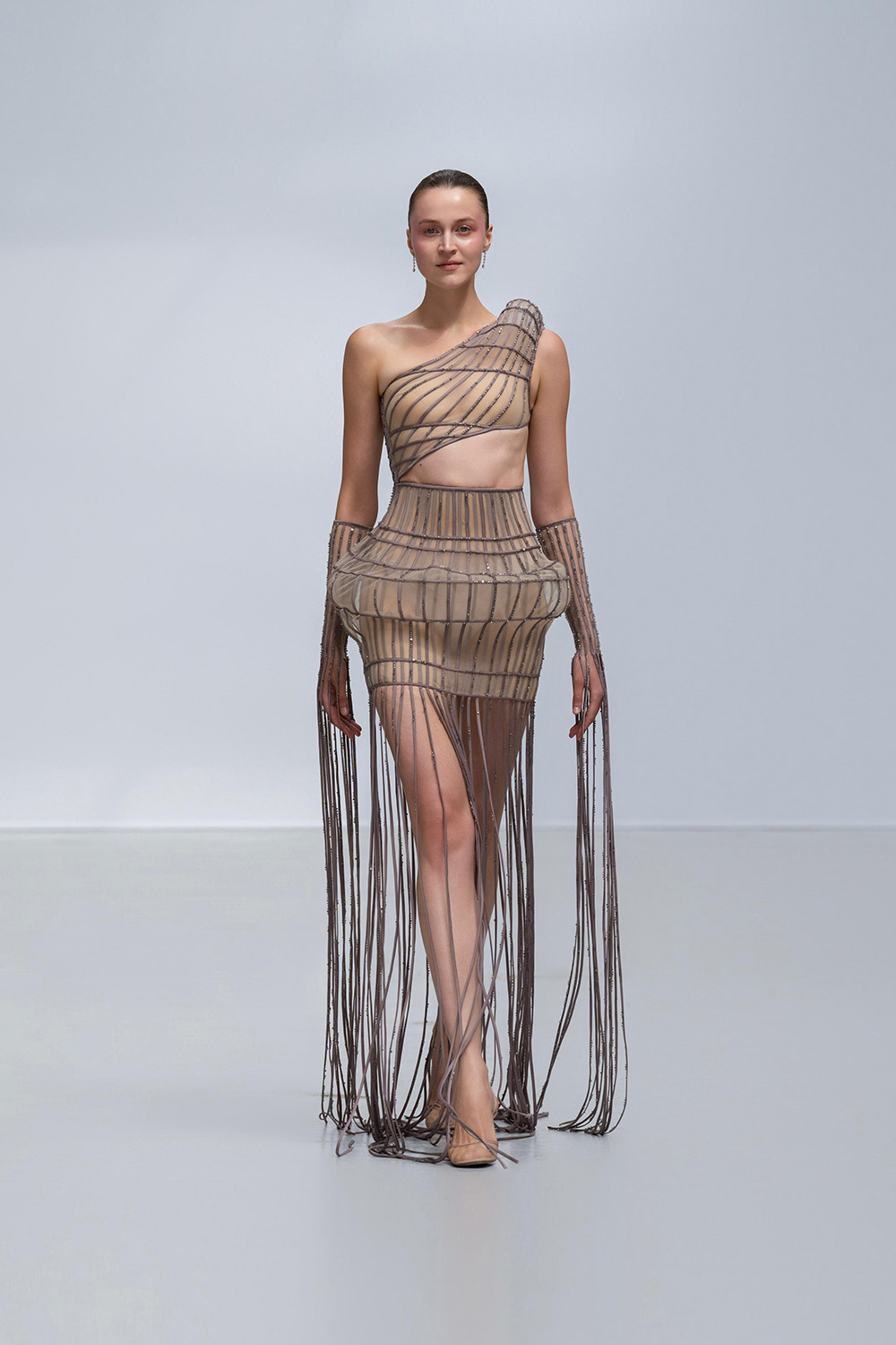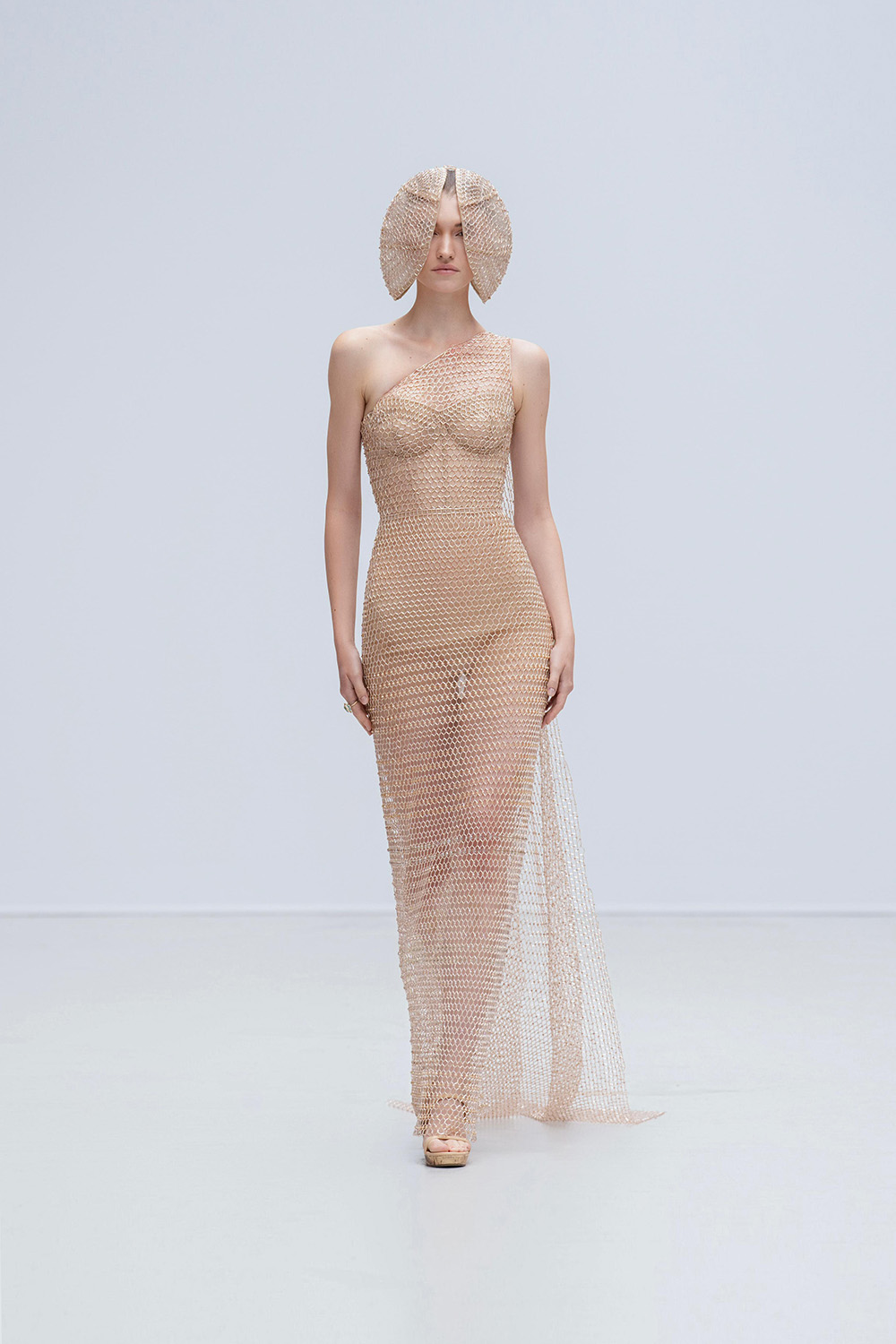 Bộ sưu tập Haute Couture Thu Đông 2025 tiếp tục khai thác kỹ thuật làm nên tên tuổi của Phan Huy – lưới đàn hồi xử lý chuyển màu, tạo hiệu ứng ánh sáng tinh tế và chuyển động mềm mại theo từng bước đi.