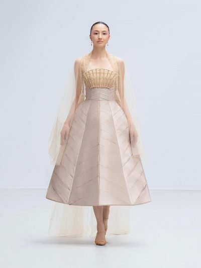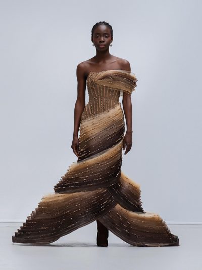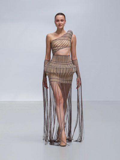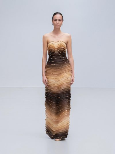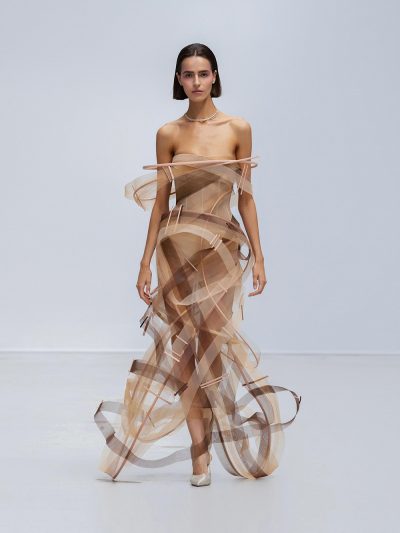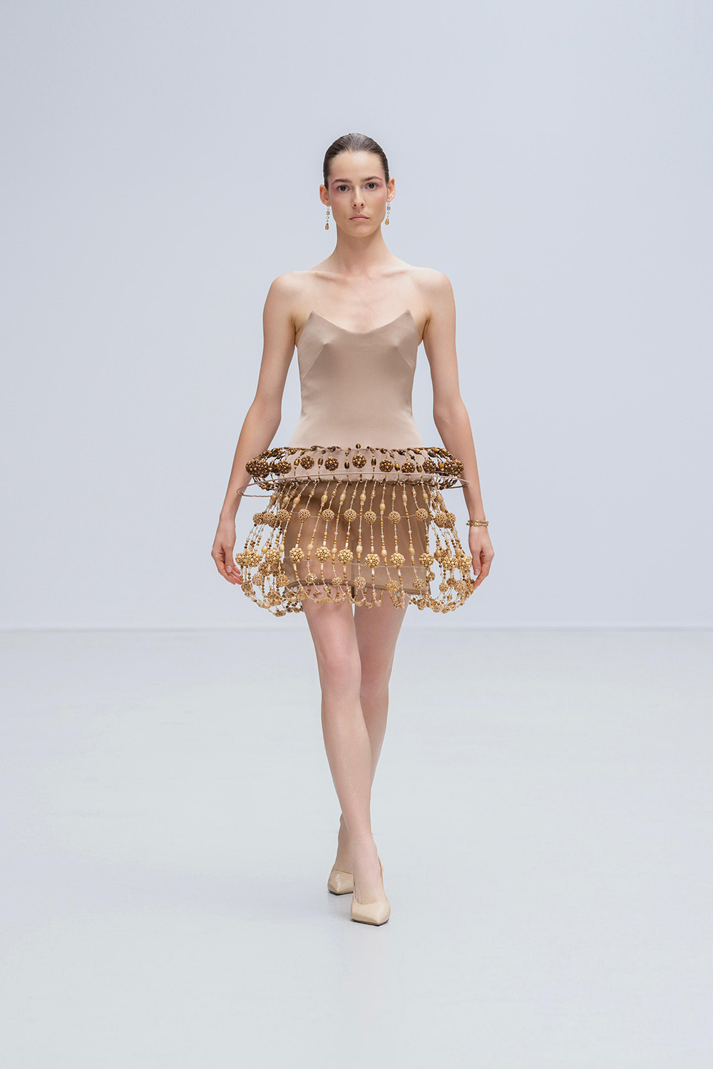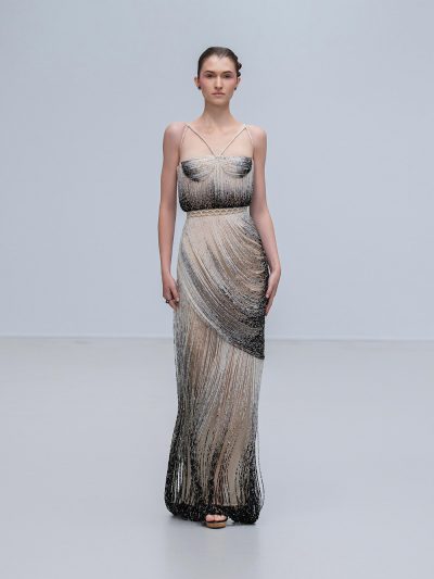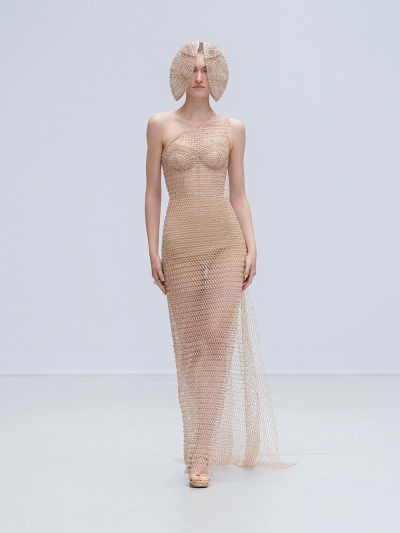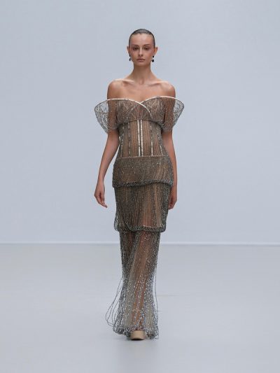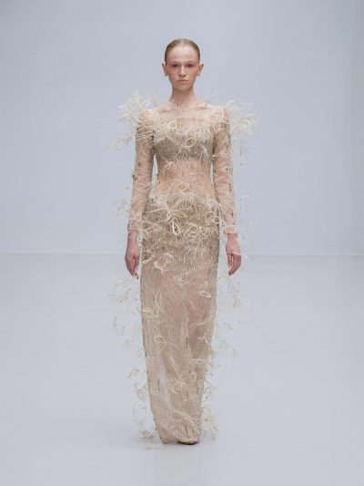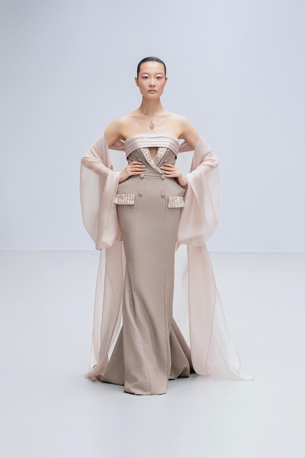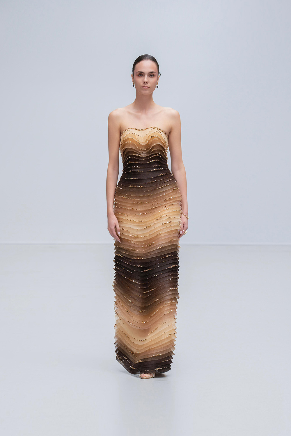 Bộ sưu tập Haute Couture Thu Đông 2025 tiếp tục khai thác kỹ thuật làm nên tên tuổi của Phan Huy – lưới đàn hồi xử lý chuyển màu, tạo hiệu ứng ánh sáng tinh tế và chuyển động mềm mại theo từng bước đi.
