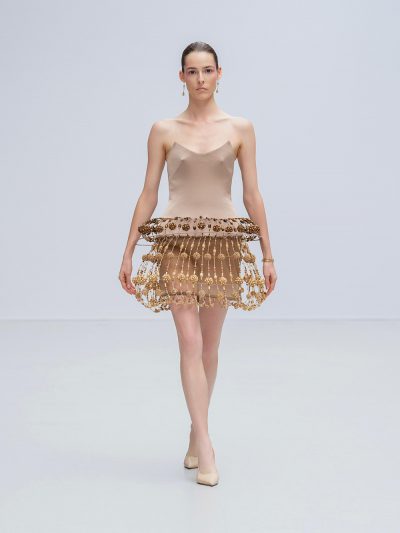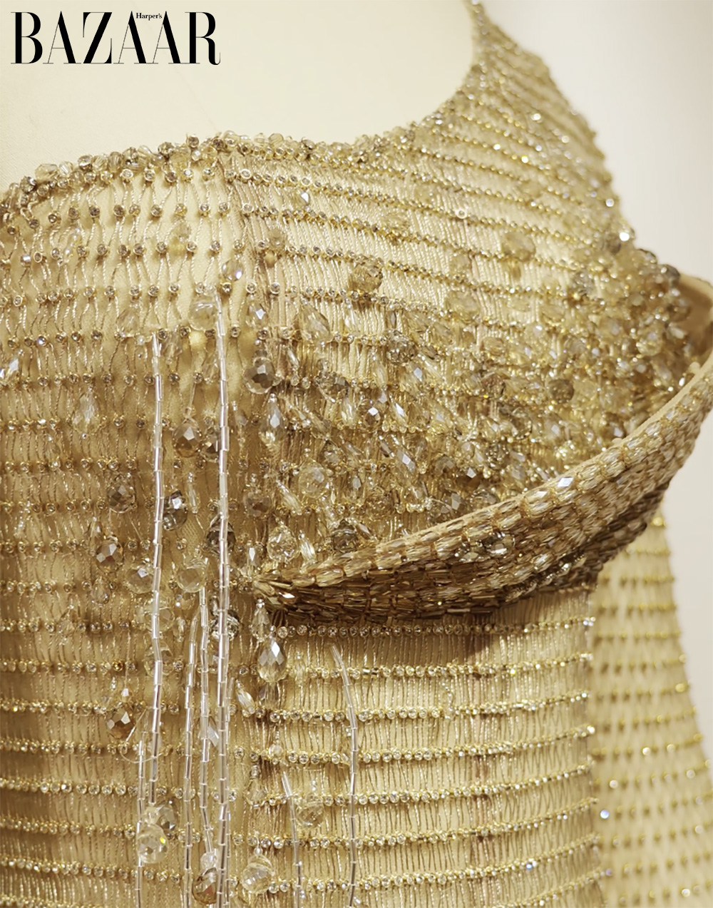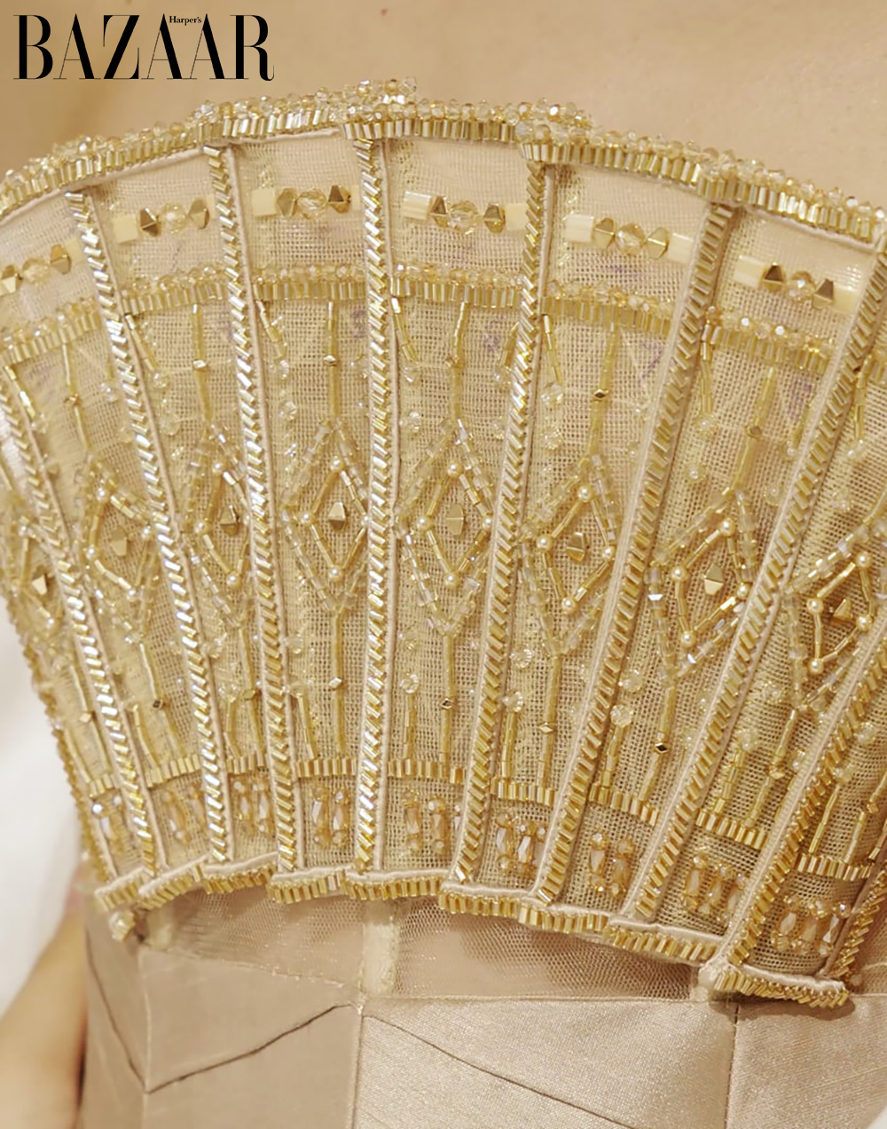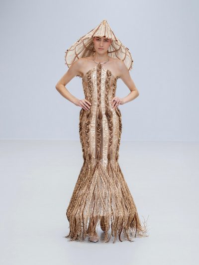 Quạt giấy được điểm xuyết nơi ngực, eo, hông như làn gió tuổi thơ thoảng qua trưa hè yên ả. Nón lá hiện lên mềm mại qua kỹ thuật thắt dây đính pha lê, phản chiếu vẻ đẹp dịu dàng của người phụ nữ Việt. Những chuyển động lao động được mô phỏng bằng hình ảnh lưới và thuyền cá, gợi nhịp sống miền sông nước.