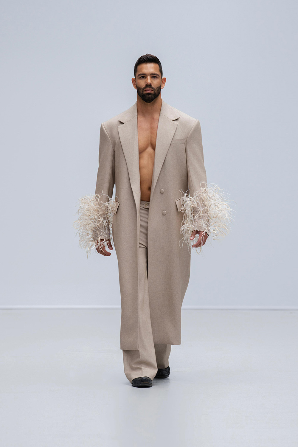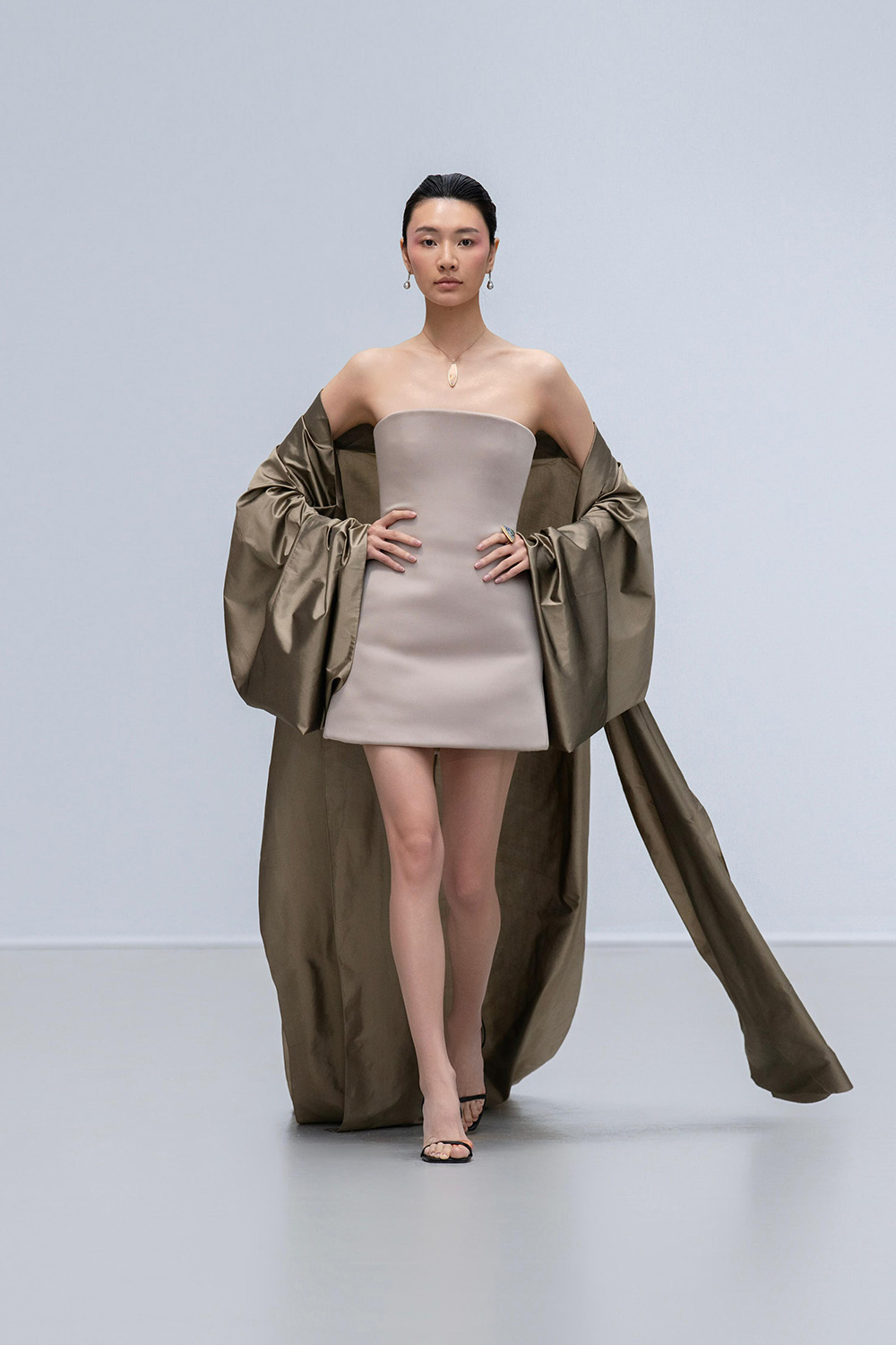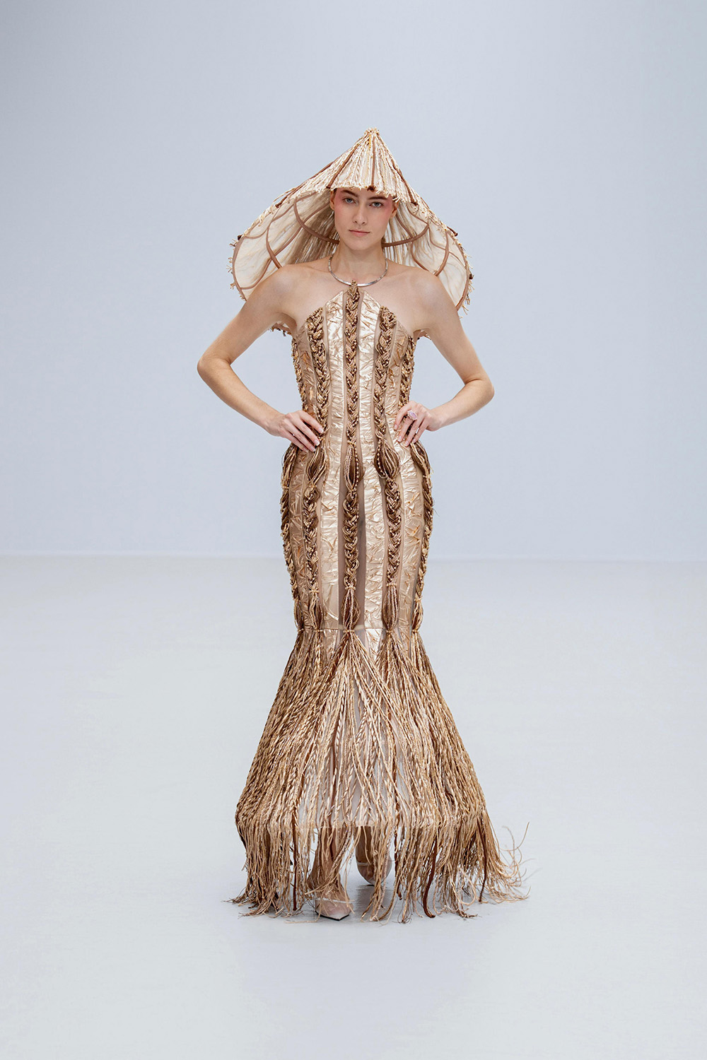Trong khi đó, lá chuối, rơm rạ và bếp than khơi dậy ký ức mộc mạc nơi làng quê. Áo Nhật Bình và áo dài – khăn đóng mang đến tinh thần giao thoa, kế thừa và hội nhập. Mỗi thiết kế là một lát cắt văn hóa, gợi hình ảnh, âm thanh và cảm xúc, chạm vào những ký ức sâu xa bằng ngôn ngữ tạo phom tinh tế và chất liệu được xử lý công phu.