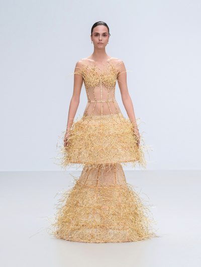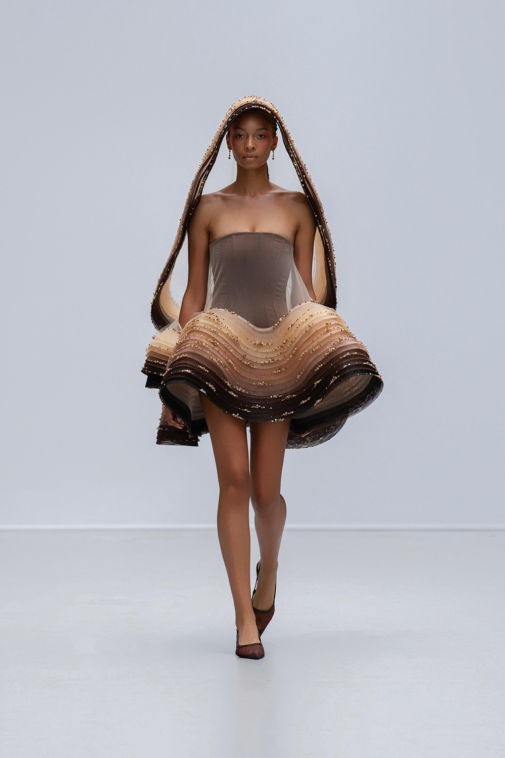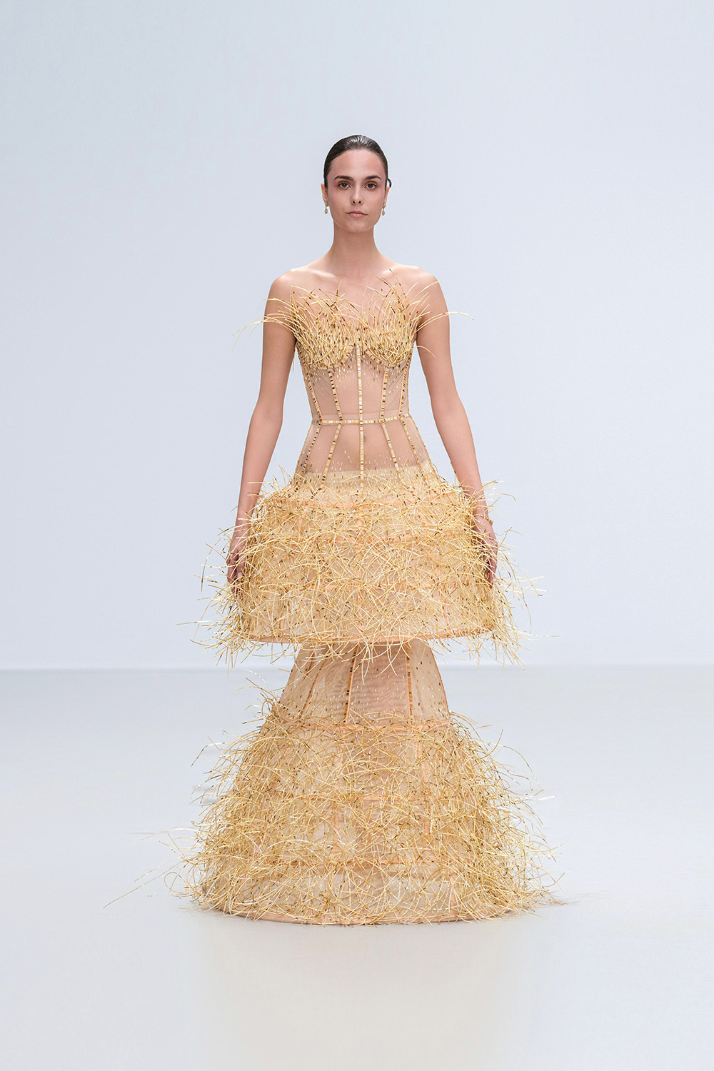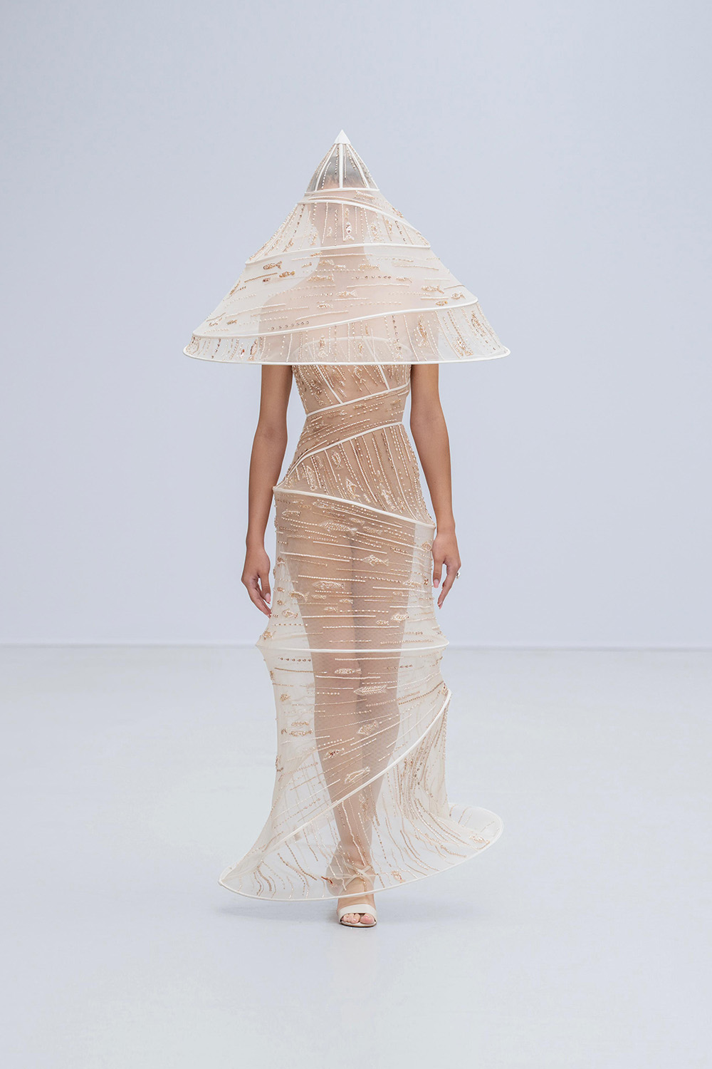 Bộ sưu tập Haute Couture Thu Đông 2025/2026 của PHAN HUY gồm 36 thiết kế lấy cảm hứng từ biểu tượng đời sống nông thôn Việt Nam, như quạt giấy, nón lá, lưới đánh cá, lá chuối, rơm rạ hay bếp than.