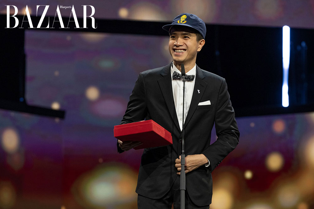 Đạo diễn Phạm Ngọc Lân không giấu nổi niềm vui trên sân khấu Liên hoan phim Berlin. Ảnh: Twitter @FestivalScope