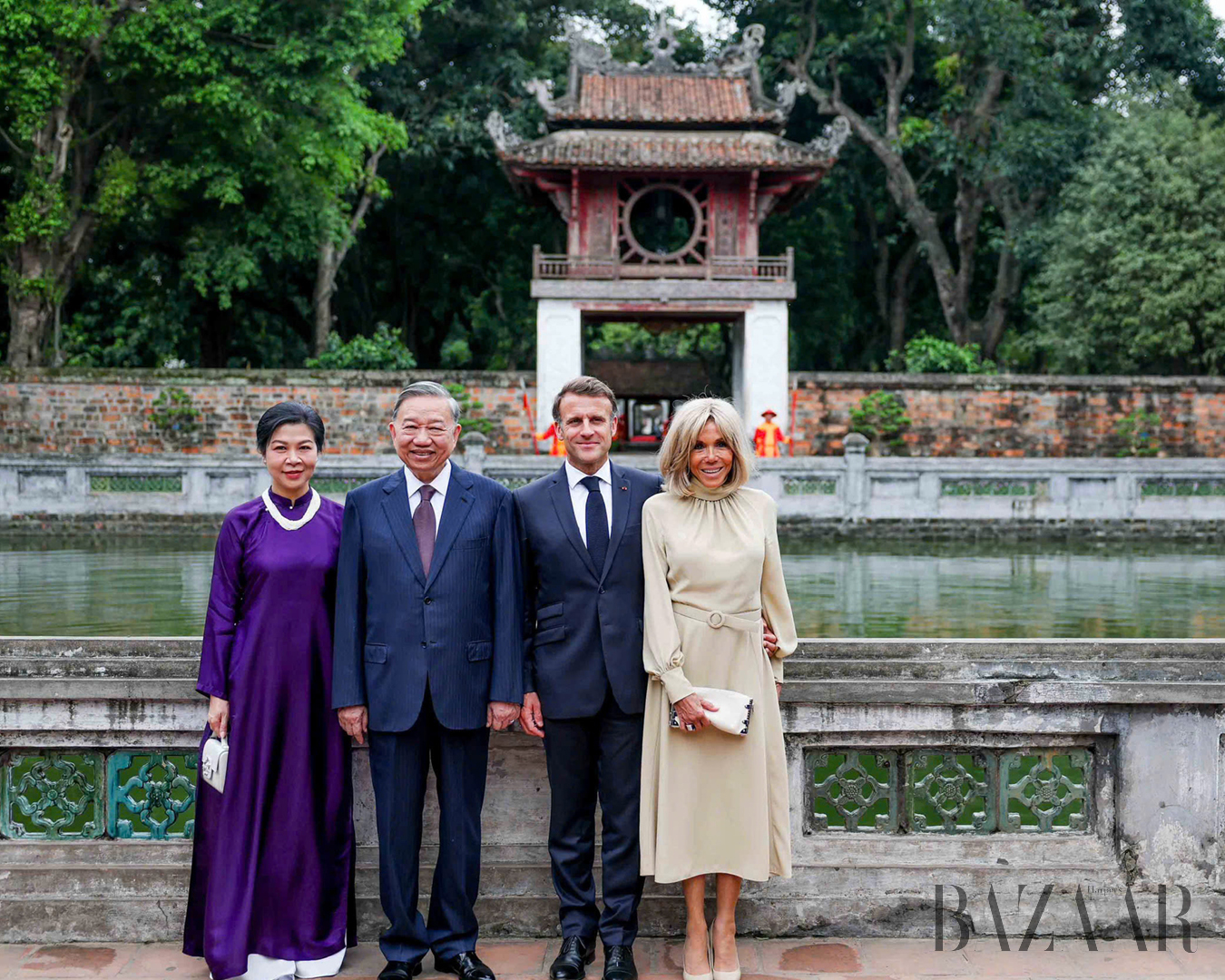 Mỗi bộ áo dài bà mặc đều được tính toán kỹ lưỡng từ màu sắc đến chất liệu. Khi đón tiếp vợ chồng Tổng thống Pháp Emmanuel Macron hồi tháng 5 tại Văn Miếu, Quốc Tử Giám, Hà Nội, bà diện áo dài tím đồng điệu với màu cà-vạt của Tổng bí thư Tô Lâm. Sắc tím tượng trưng cho vẻ sang trọng và quyền lực, được bà phối cùng màu trắng qua quần lụa, túi xách và chuỗi ngọc trai, tạo nên vẻ hài hòa.