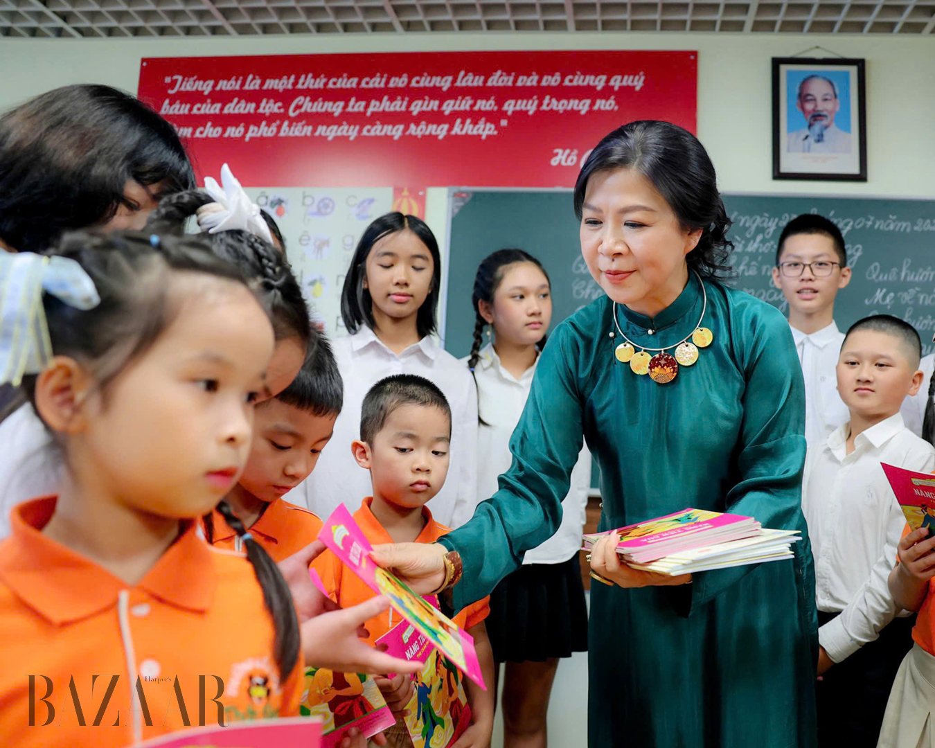 Cũng trong chuyến đi này, khi tới thăm lớp học tiếng Việt tại Nga, phu nhân Tổng Bí thư tạo vẻ thanh lịch bằng sắc xanh mòng két kết hợp trang sức sơn mài do họa sĩ Trương Dũng chế tác, thể hiện sự giao thoa giữa nghệ thuật đương đại và truyền thống Việt.