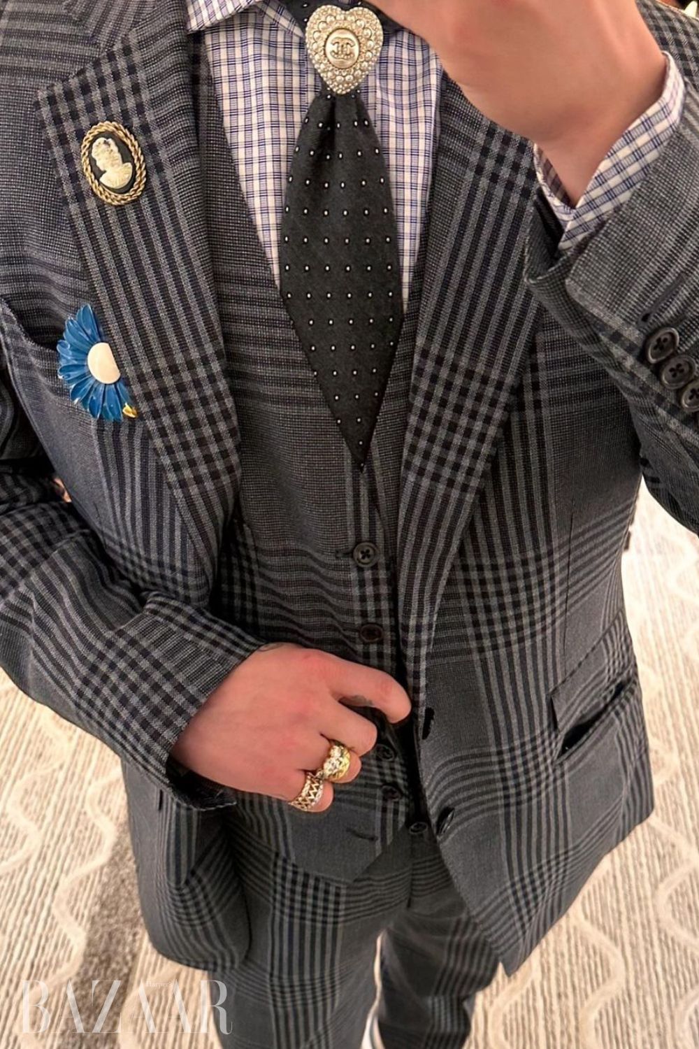 Anh chàng mặc bộ cánh phong cách tối đa (maximalism) cực kỳ hoa lá và đầy màu sắc, đầu quàng khăn kiểu cụ bà yêu thích của mình. Điệu bộ đi lại thì nhấp nha nhấp nhổm như người bị bệnh rối loạn tăng động giảm chú ý (ADHD) nhưng lại vẫn toát ra chất ngầu không lẫn vào đâu được.