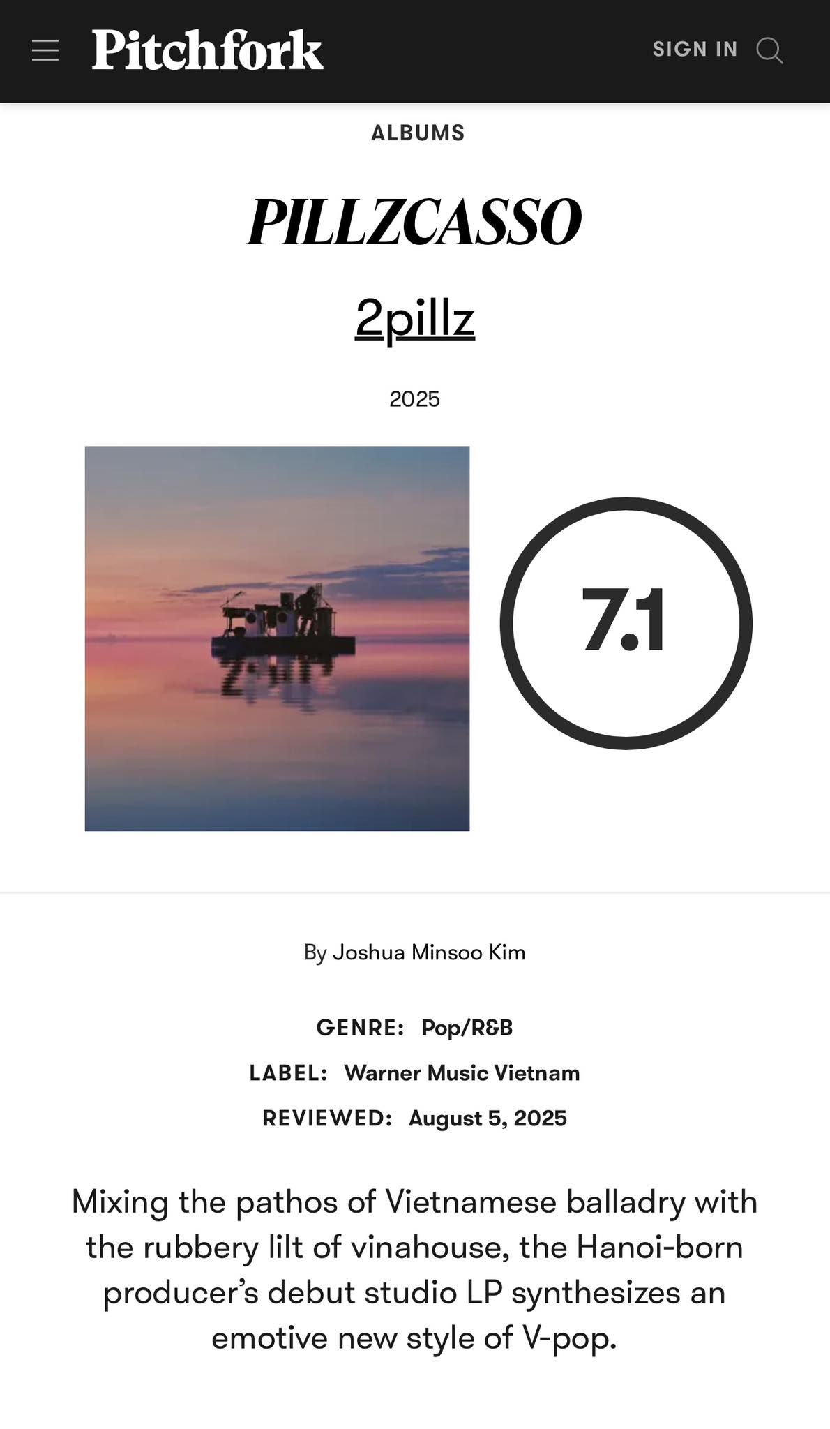 Tạp chí chuyên đánh giá âm nhạc quốc tế Pitchfork bất ngờ dành lời khen cho album PILLZCASSO của nhà sản xuất âm nhạc Việt Nam – 2pillz, chấm album này số điểm 7,1. Đây là một con số đầy lạc quan, đặc biệt khi đến từ một nền tảng chấm điểm âm nhạc vốn nổi tiếng khắt khe như Pitchfork.
