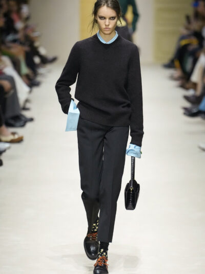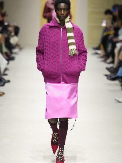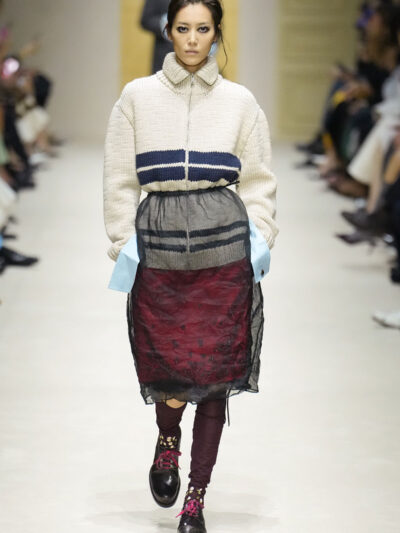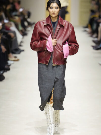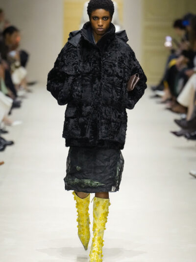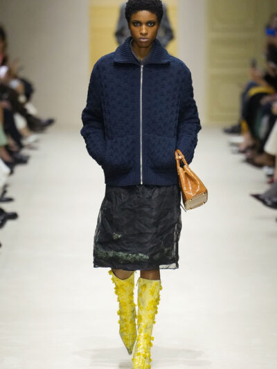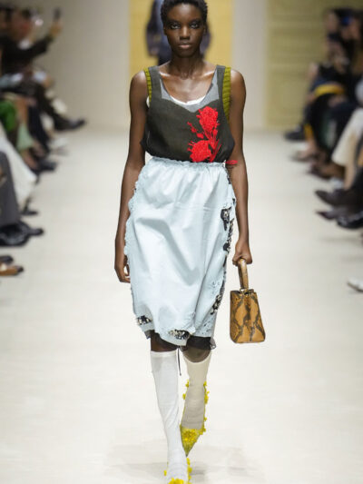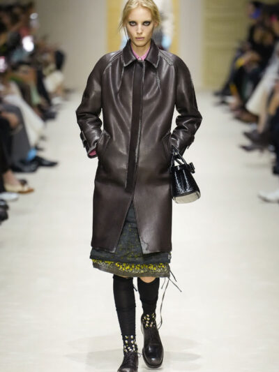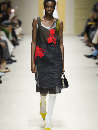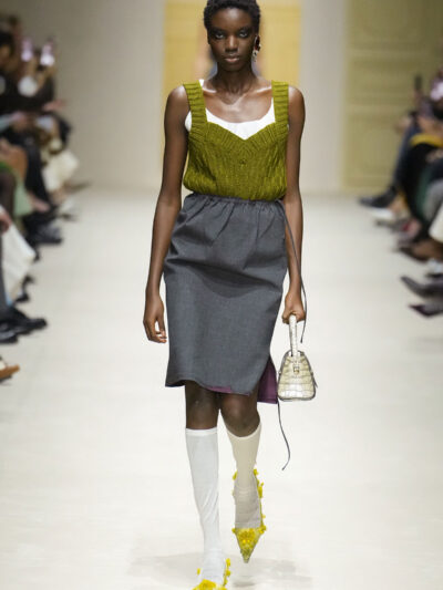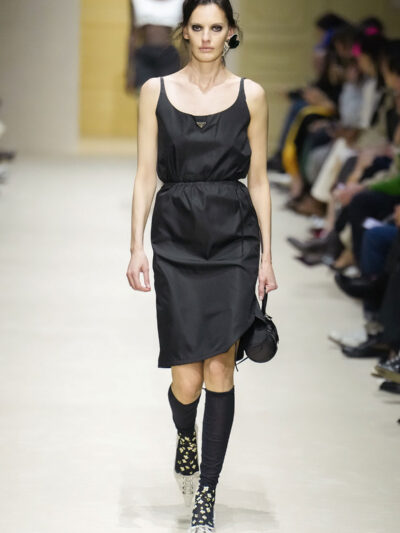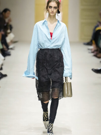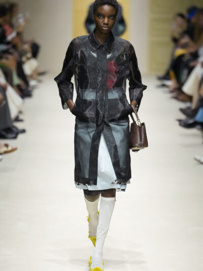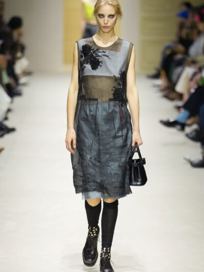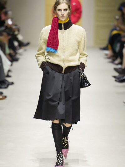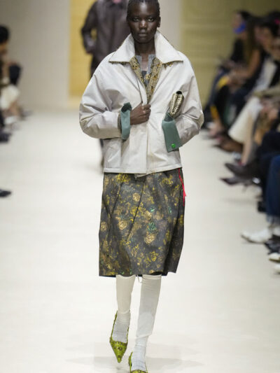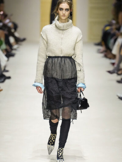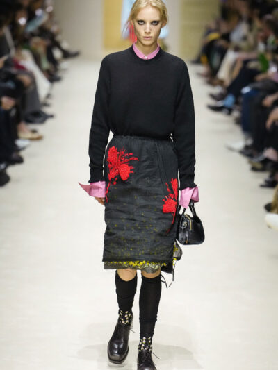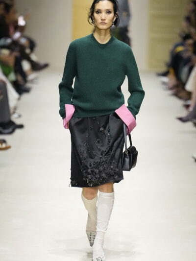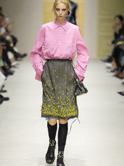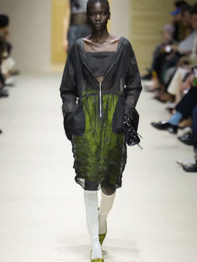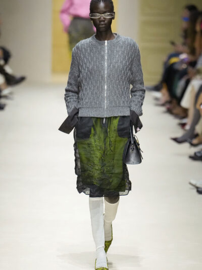 Tất nhiên, cách phối đồ theo đúng trường phái trừu tượng và ngẫu hứng của Prada. Các thiết kế hoàn toàn không vừa vặn với nhau, khi váy satin điệu đà lại mặc cùng áo khoác kiểu quân đội, hay lớp dưới màu hồng bóng bẩy bị che phủ bởi áo tweed màu trầm. Các loại vải được xếp chồng lên nhau như thể bị ăn mòn theo thời gian, gợi lên những vật dụng thực sự đã trải qua sử dụng.