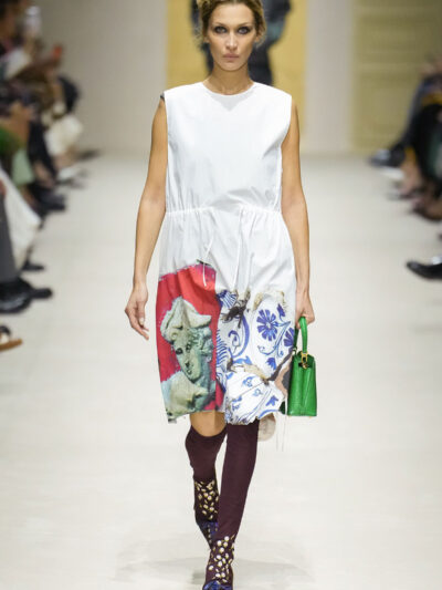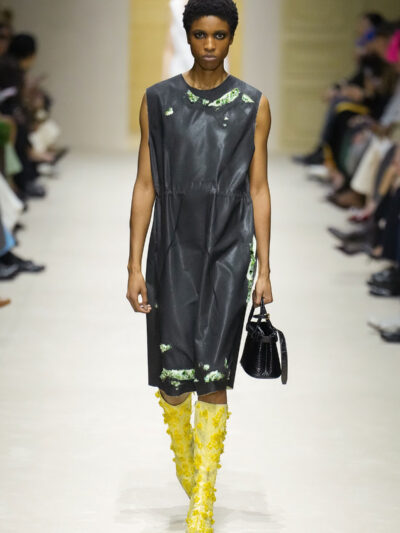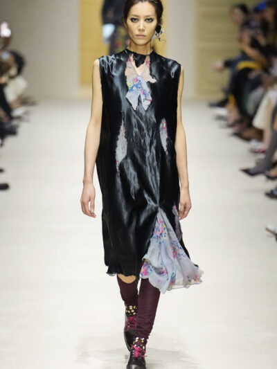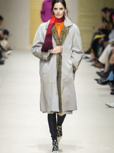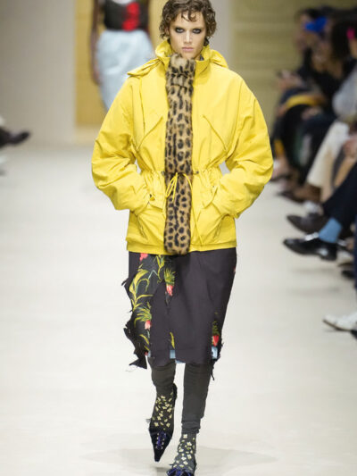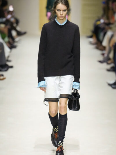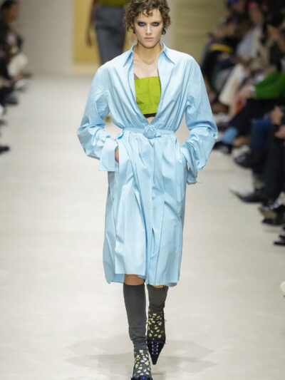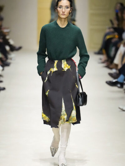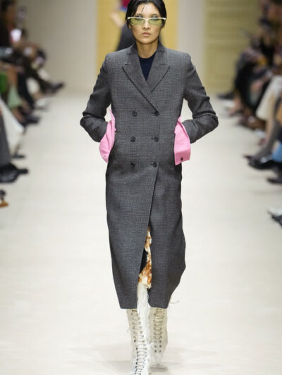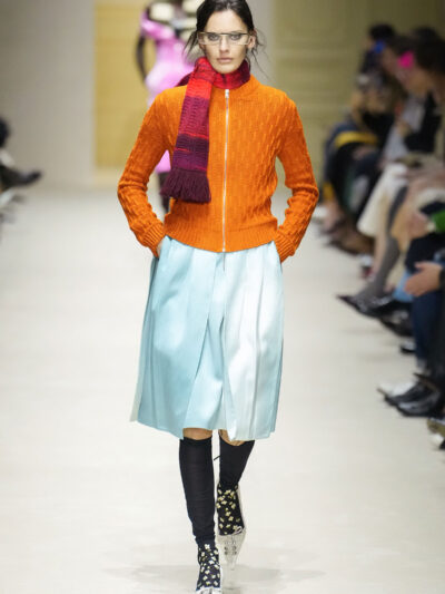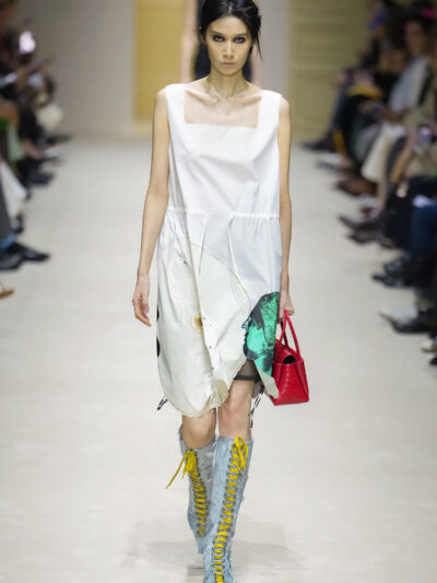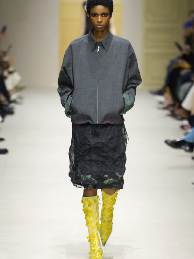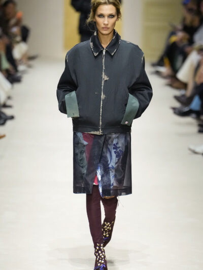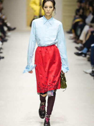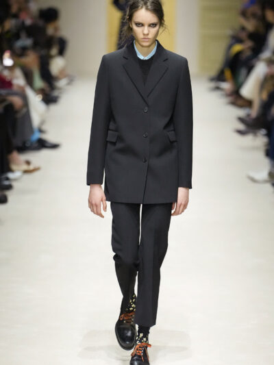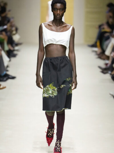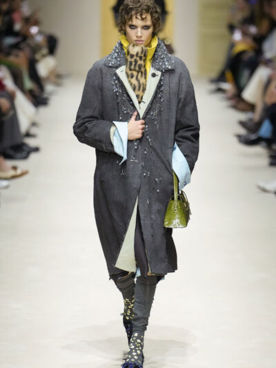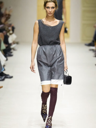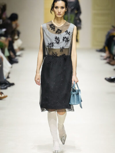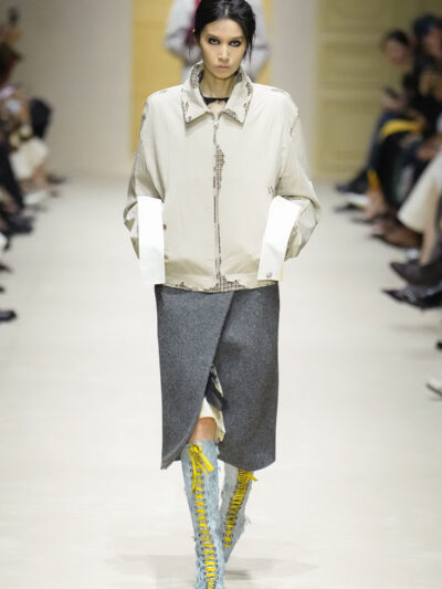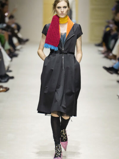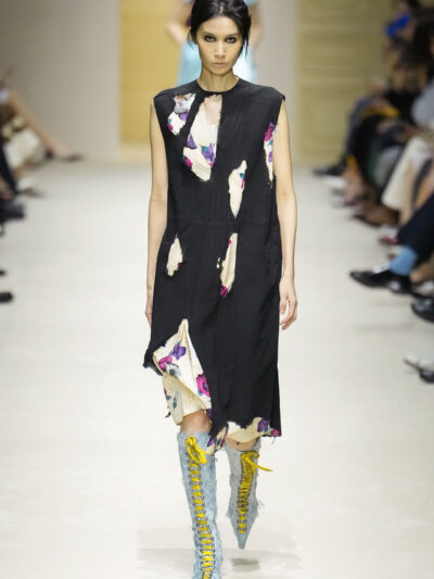 Tất nhiên, cách phối đồ theo đúng trường phái trừu tượng và ngẫu hứng của Prada. Các thiết kế hoàn toàn không vừa vặn với nhau, khi váy satin điệu đà lại mặc cùng áo khoác kiểu quân đội, hay lớp dưới màu hồng bóng bẩy bị che phủ bởi áo tweed màu trầm. Các loại vải được xếp chồng lên nhau như thể bị ăn mòn theo thời gian, gợi lên những vật dụng thực sự đã trải qua sử dụng.