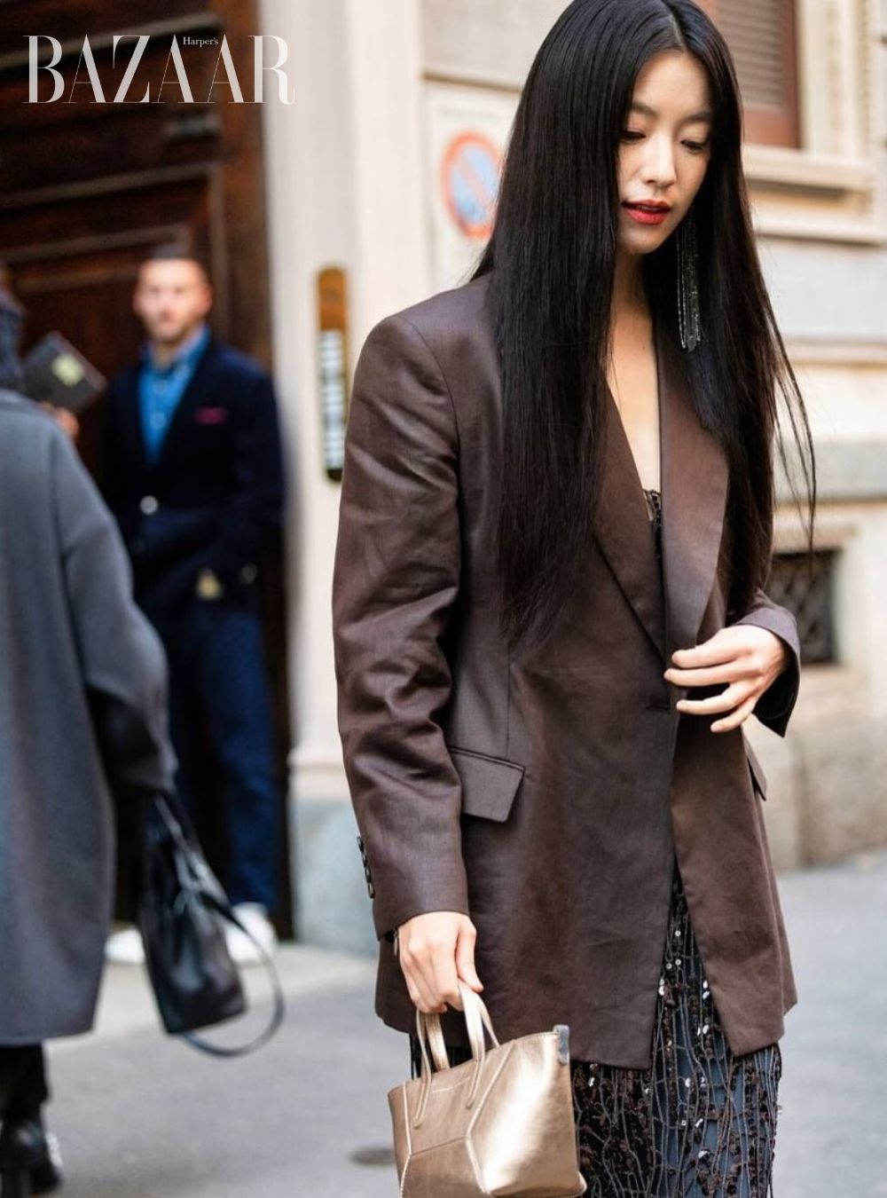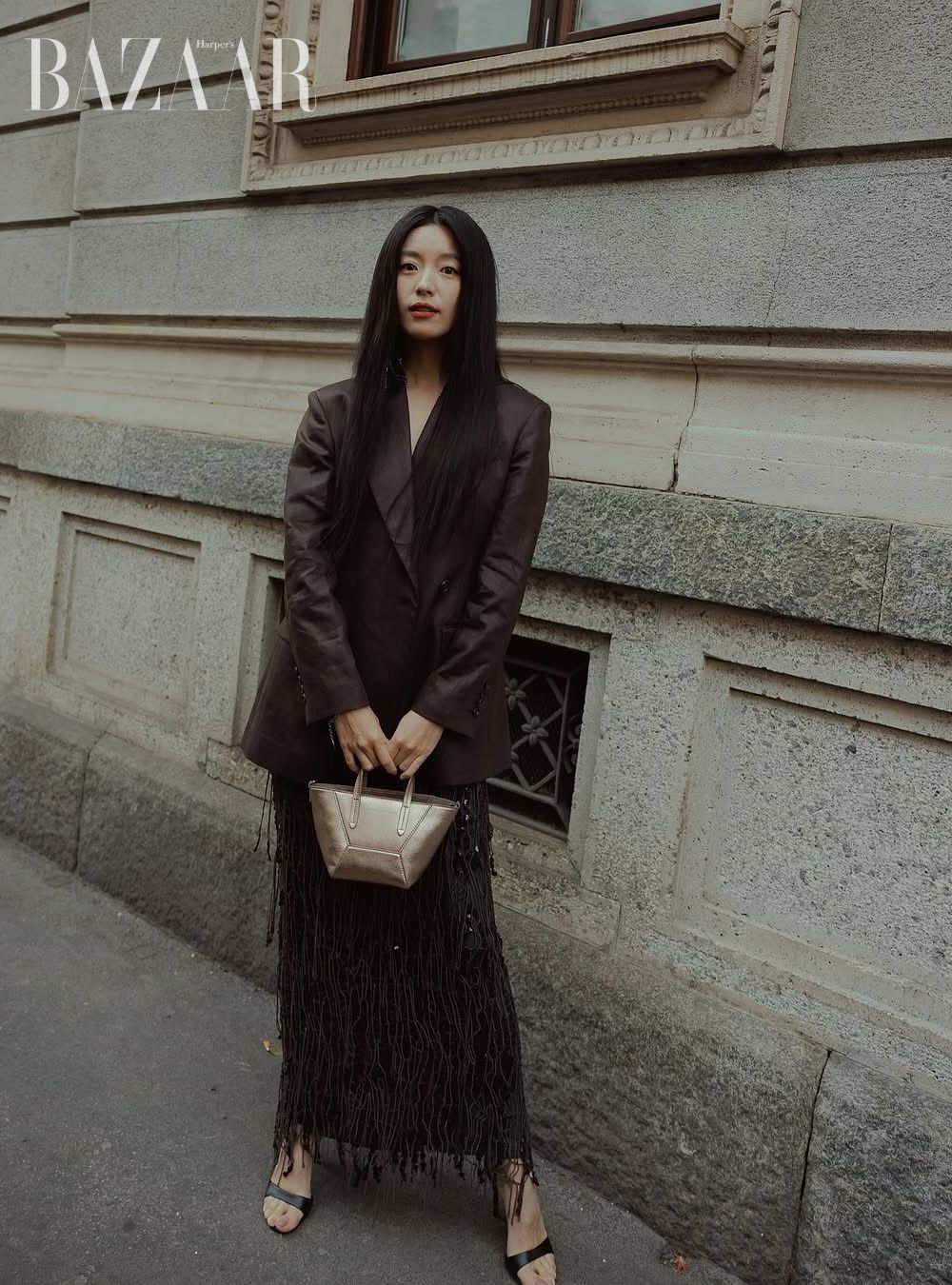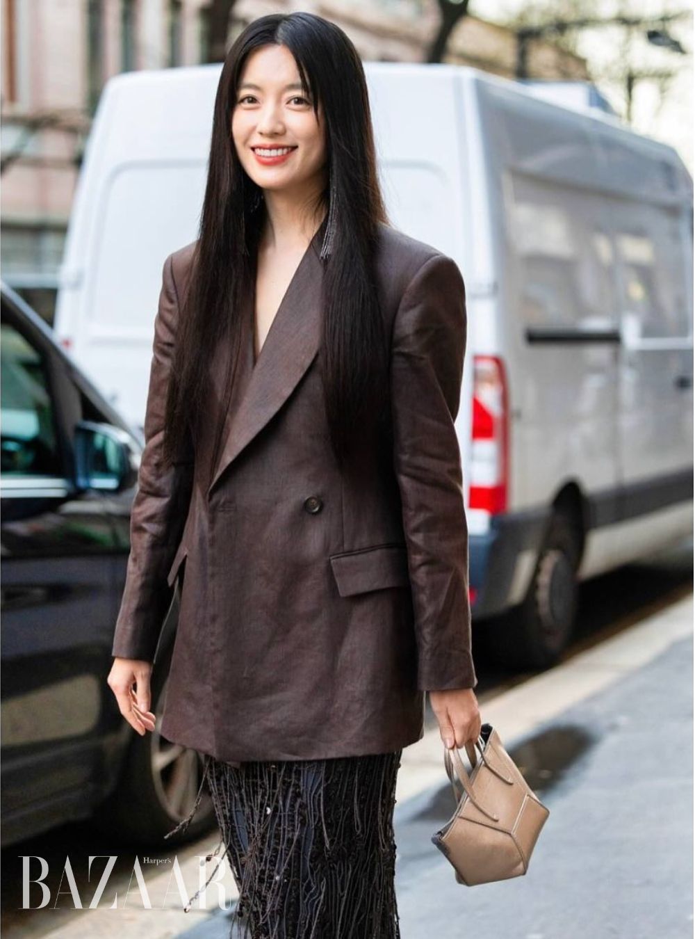 Trang phục tối màu mà thương hiệu giao phó cho Han Hyo Joo hoá ra lại là lựa chọn thuyết phục nhất để tôn lên vẻ rạng rỡ của nữ diễn viên được mệnh danh là sở hữu nụ cười đẹp nhất xứ Hàn. Cô diện áo blazer nâu, kết hợp với chân váy đen tua rua và giày sandal cao gót. Chiếc túi xách BC Duo của cô được làm từ da bê dệt ngân tuyến (lamé), có hiệu ứng metallic sáng bóng nhờ lớp phủ đặc biệt. Toàn bộ diện mạo của Han Hyo Joo đều toát lên vẻ thanh lịch, khiến cô nhận được nhiều lời khen từ người hâm mộ.