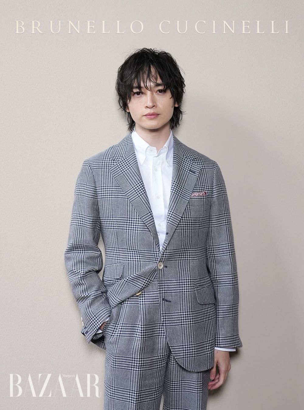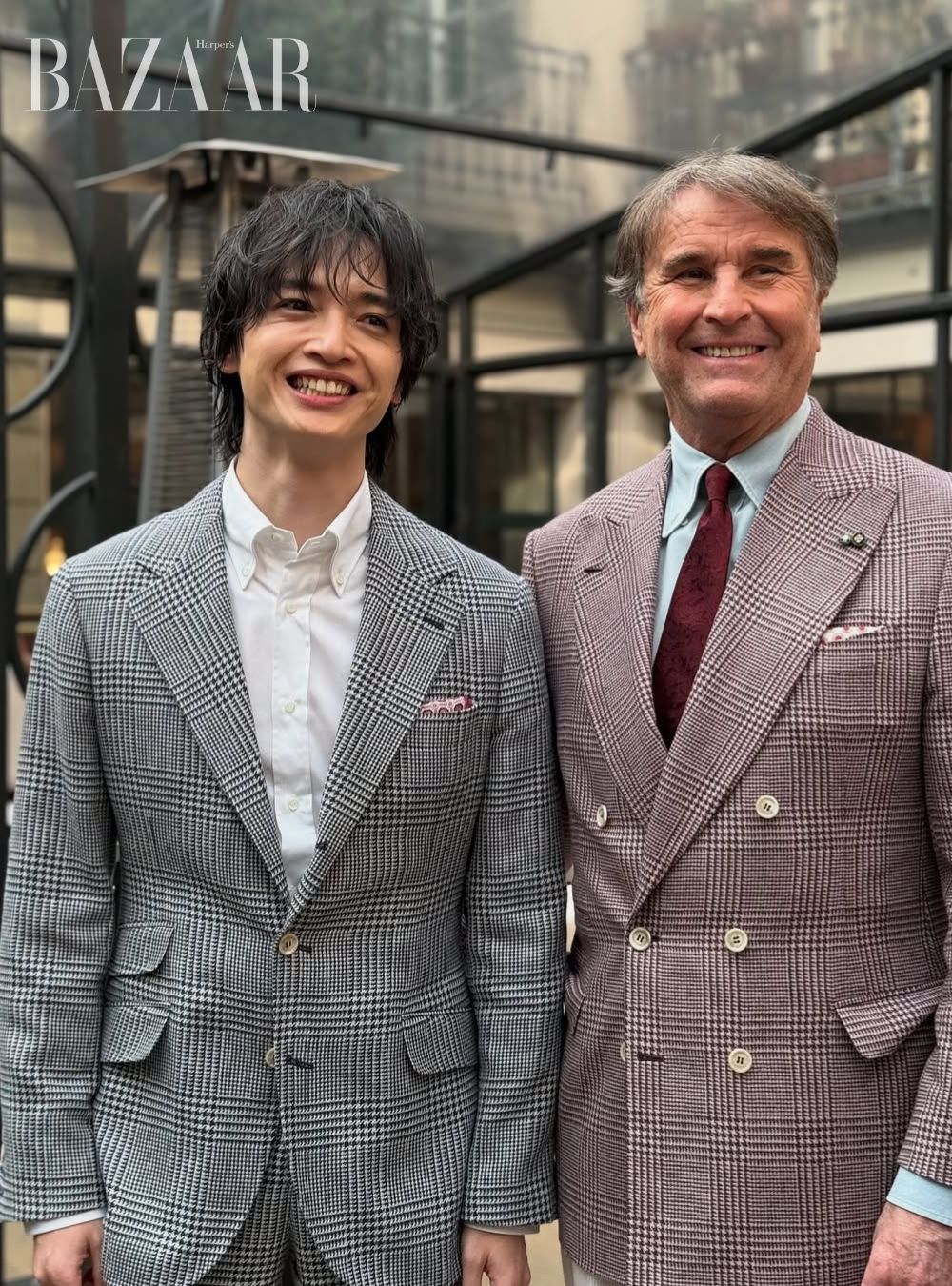 Đại diện của thị trường Nhật, Yuta Tamamori, tôn vinh tay nghề may suit tuyệt vời của Brunello Cucinelli. Phần cà vạt được lược bỏ để phù hợp với vẻ trẻ trung của anh. Hoạ tiết sọc trên suit tương đồng với bộ cánh của nhà sáng lập thương hiệu, làm nên khoảnh khắc vô cùng thú vị khi cả hai đứng chung khung hình.
