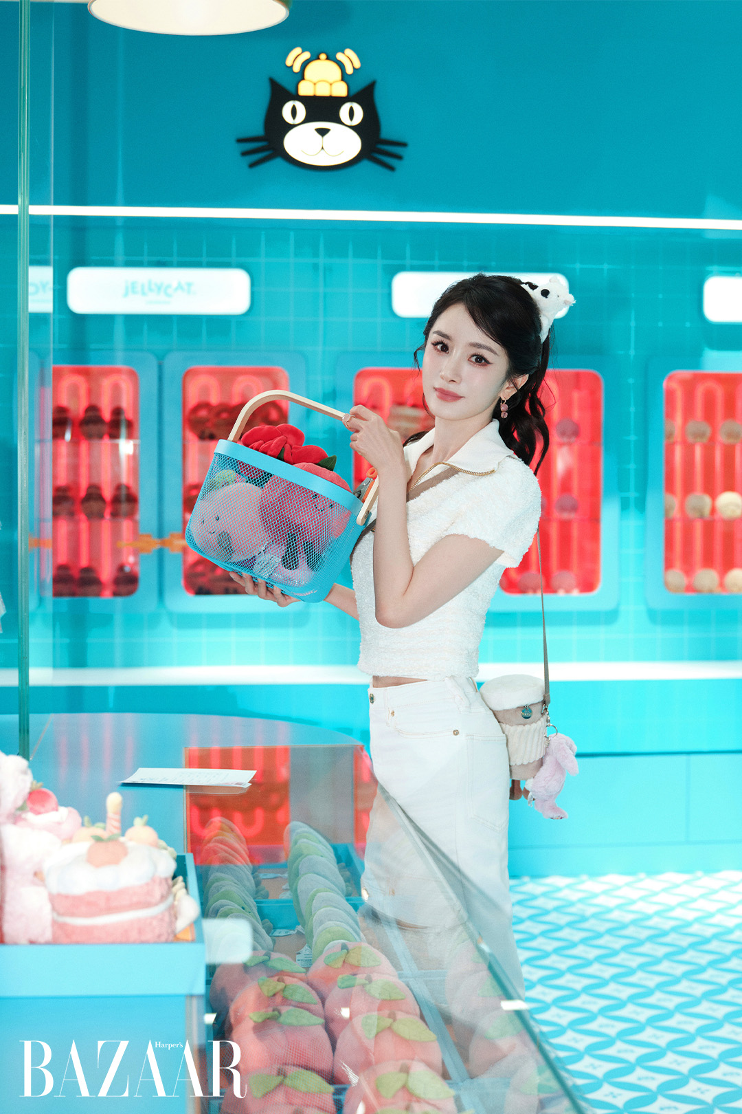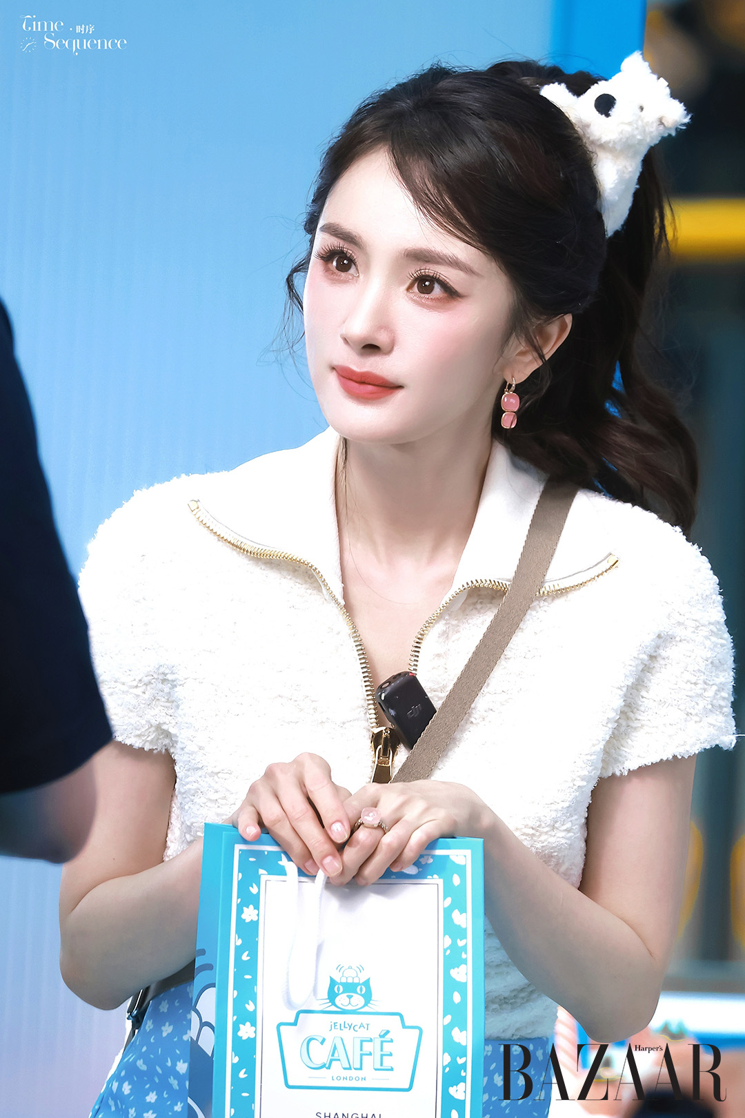 Ngày 8/9, trong sự kiện khai trương Jellycat Café pop-up store tại Thượng Hải, Dương Mịch một lần nữa khiến giới mộ điệu ngỡ ngàng. Cô tinh nghịch cài móc khóa chó Munro Scottie Dog lên tóc như một phụ kiện, khiến visual trở nên cute hết nấc.