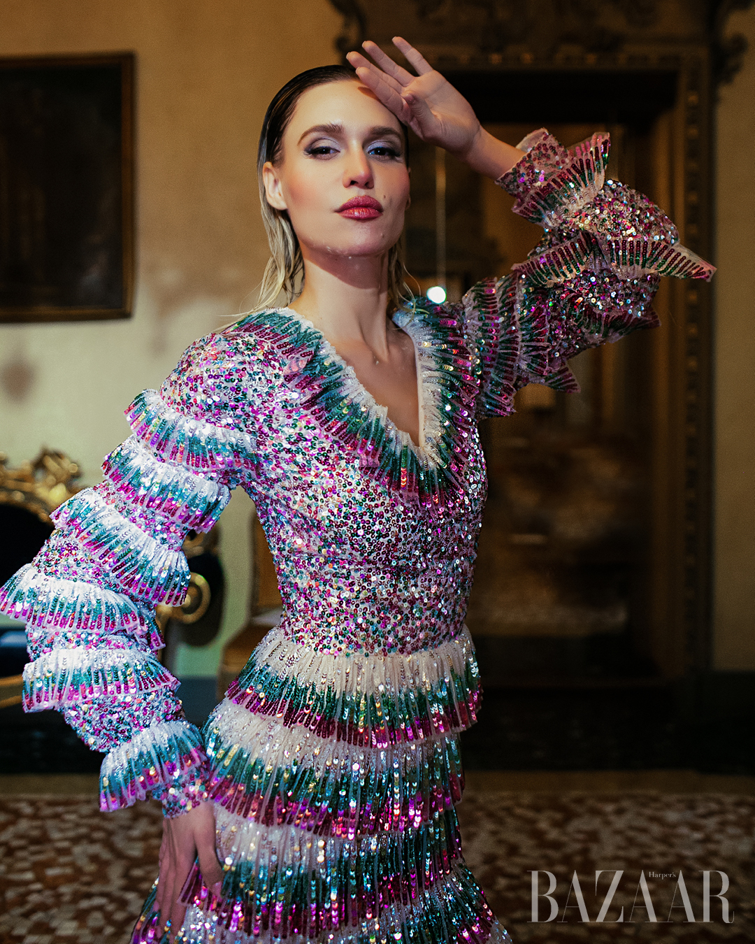 Each creation is crafted using carefully selected precious fabrics, chosen for their ability to reflect light and accompany movement. Embroidery, artisanal applications and fluid fringes are entirely hand-made and become an integral part of the garment’s structure. As the wearer moves, the dresses appear to come alive, vibrating subtly and transforming into luminous, almost sculptural forms.