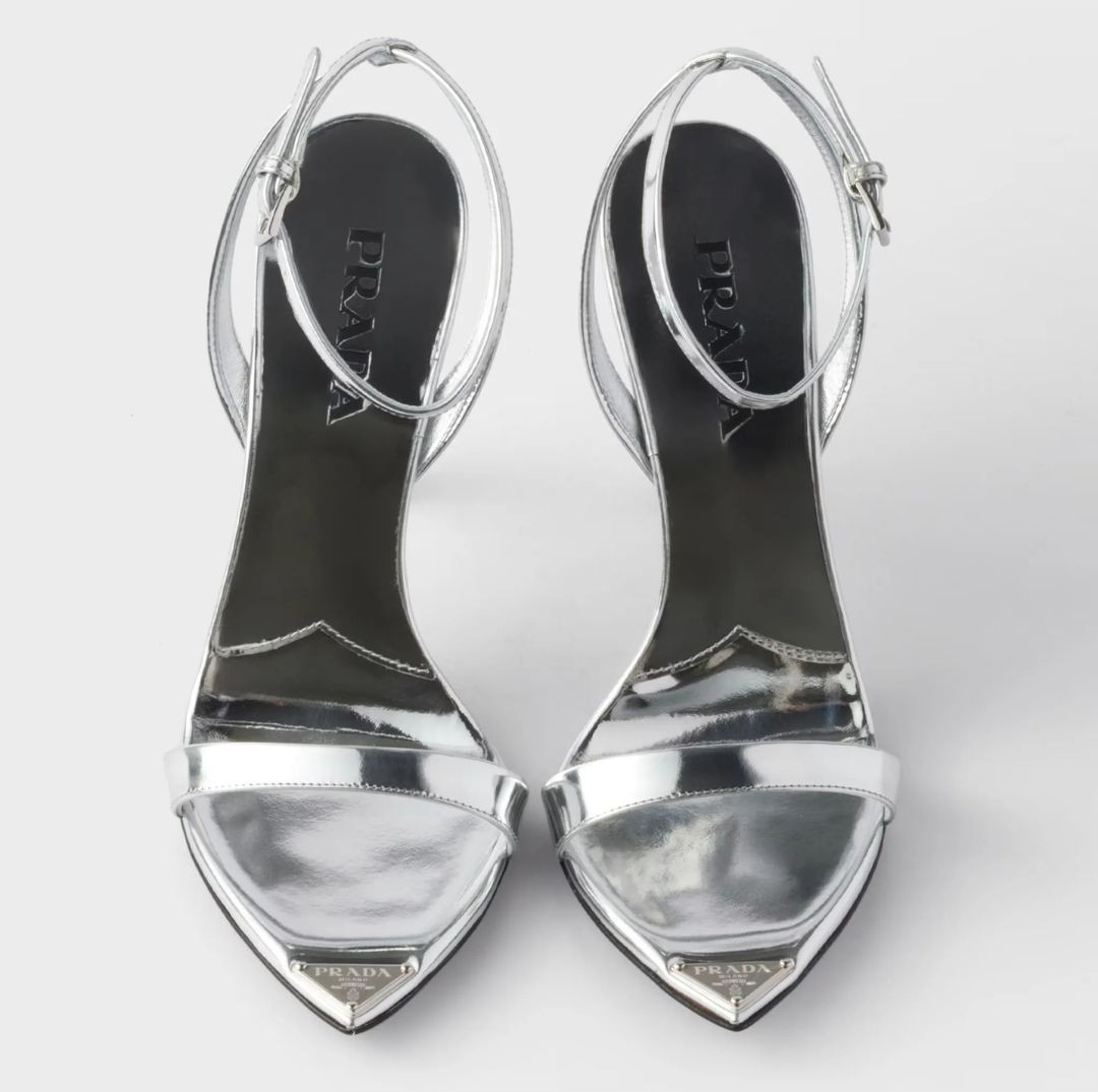 Kết hợp cùng chiếc váy là đôi giày cao gót bằng da ánh kim của Prada. Điểm nhấn của đôi giày chính là phần gót hình khối hình học lấy cảm hứng từ logo tam giác biểu tượng của hãng, mang lại vẻ hiện đại và sắc sảo cho tổng thể trang phục. Thiết kế trị giá 1.290 đô-la Mỹ.