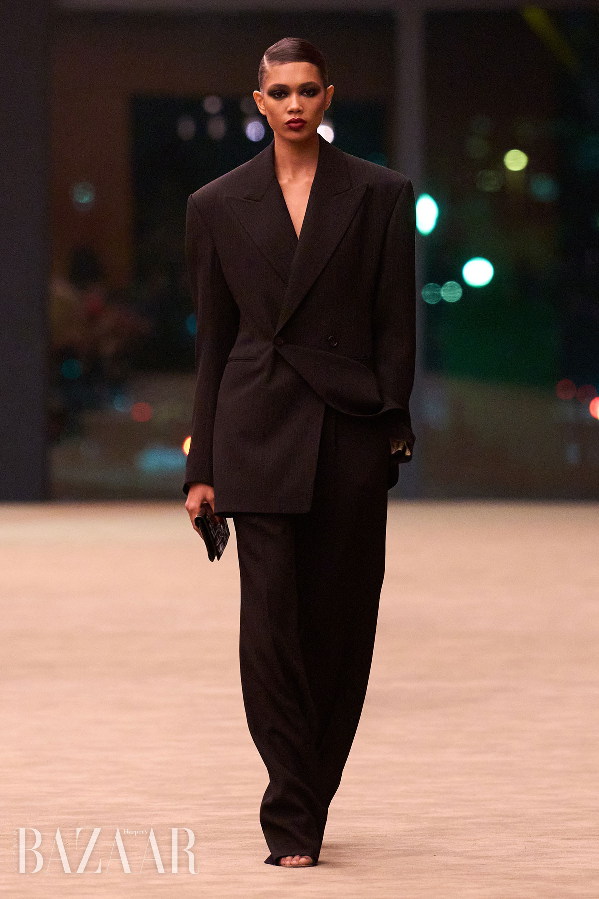 60 năm trôi qua, Le Smoking của Saint Laurent vẫn quyền lực, vẫn ấn tượng như ngày nào. Giám đốc sáng tạo Anthony Vacarello cho biết ông đã quyết định dùng bộ tuxedo kinh điển này làm điểm nhấn cho show Saint Laurent Thu Đông 2026 ngay từ khi biết về ngày lễ kỷ niệm đặc biệt của thiết kế. Và show diễn mở màn với 8 bộ suit đen với cầu vai độn rộng và ve nhọn to bản.