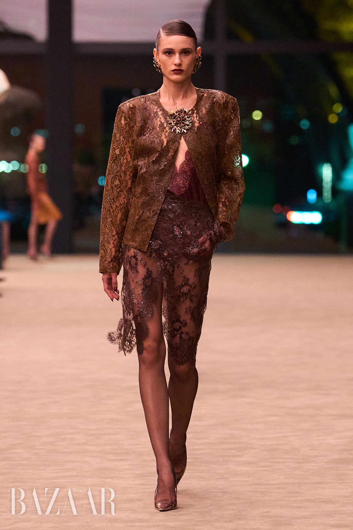 Xen kẽ với các bộ suit chính là váy áo ren. Từ nhiều mùa, những chiếc váy làm hoàn toàn bằng ren trong suốt đã trở thành đặc điểm nhận dạng của Saint Laurent và Anthony Vacarello không có lý do gì thay đổi nó trong mùa Thu Đông 2026. Tuy nhiên ở mùa này, chất liệu ren mềm mại trở nên cứng cáp hơn khi được kết hợp với latex, rồi biến tấu hành áo khoác ngoài hay chân váy.