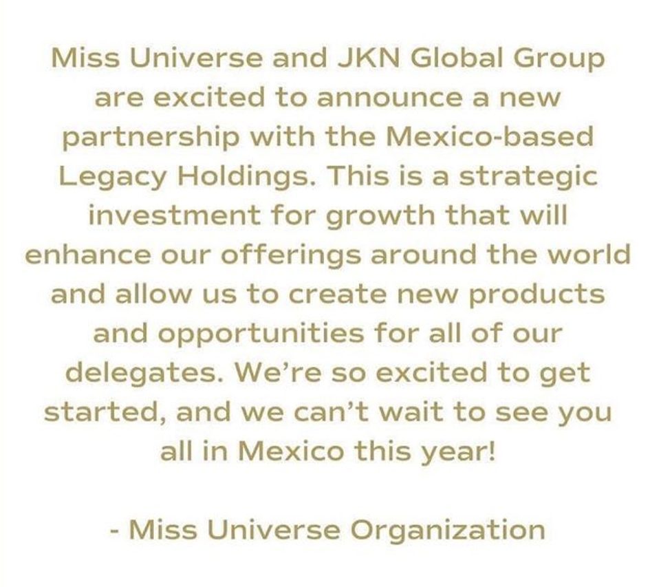 “Miss Universe và JKN Global Group vui mừng thông báo mối quan hệ hợp tác với Legacy Holding có trụ trở tại New York. Đây là một chiến lược đầu tư, phát triển nhằm nâng cao các dịch vụ của chúng tôi trên toàn cầu và cho phép chúng tôi tạo ra nhiều sản phẩm, cơ hội mới cho các đại diện của mình. Chúng tôi vui mừng bắt đầu và rất nóng lòng gặp các bạn tại Mexico năm nay.”