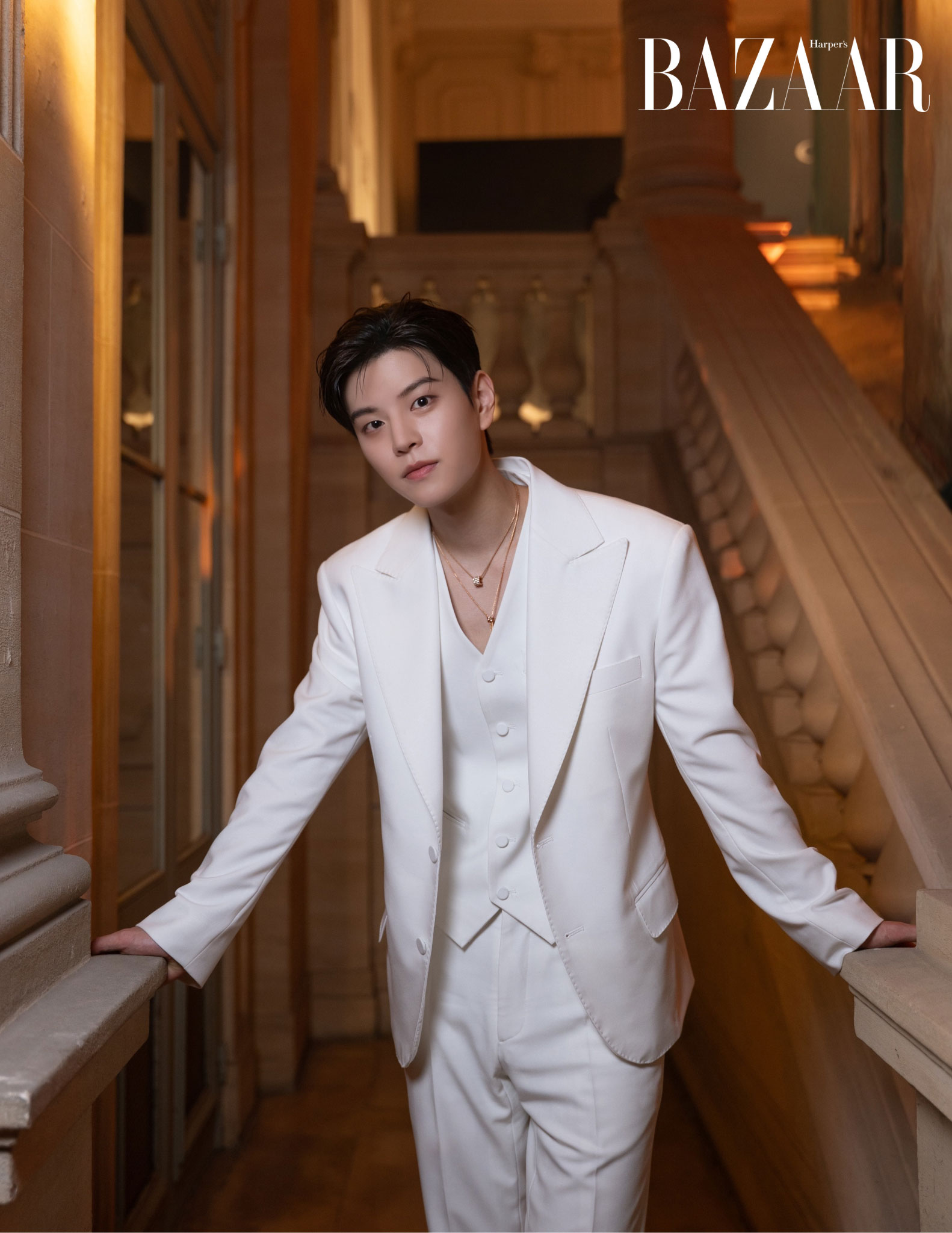 Em út Stray Kids diện cho mình một bộ suit ba mảnh trắng toát để tập trung tôn nhan sắc điển trai cùng mặt dây chuyền với được thiết kế lấy cảm hứng từ thiết kế thông minh của tổ ong, với phần sáp ong thay bằng vàng hồng 18K và mật ong thay bằng 12 viên kim cương 0,18 carats.