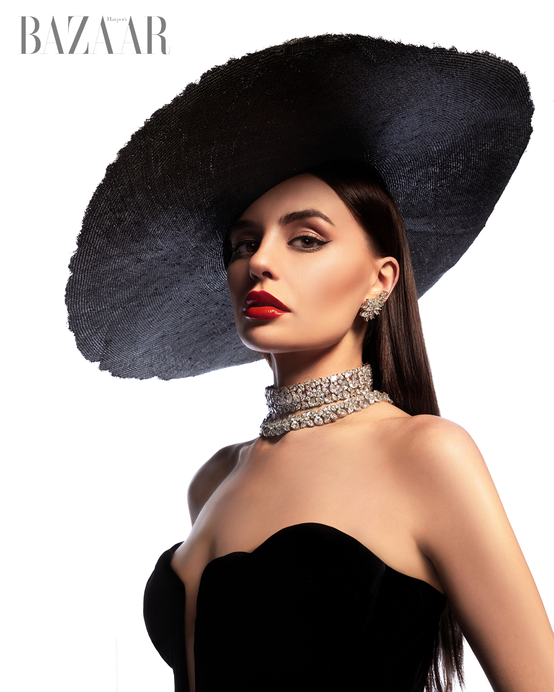 Dress: Maria Lucia Hohan from D’Orazio World. Necklaces & earrings: Anayah from D’Orazio World. Hat: Binata Millinery.