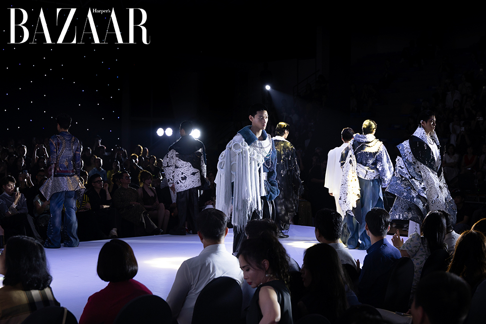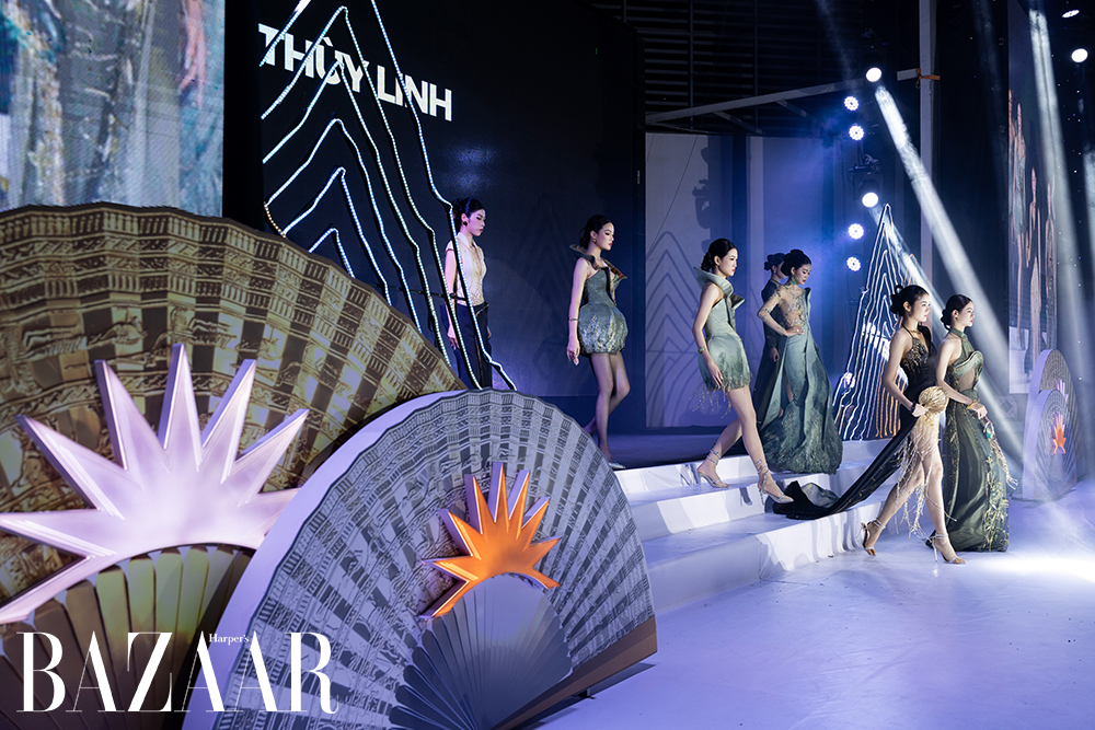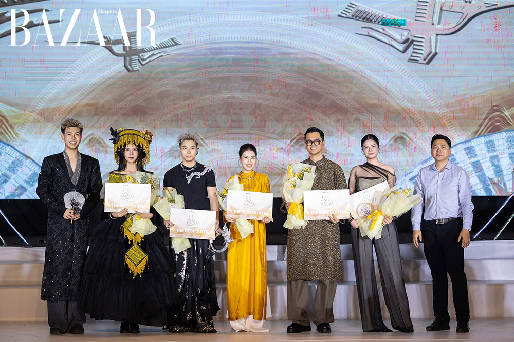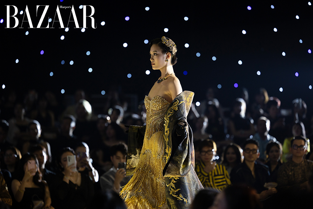 Lấy sắc đen làm nền tảng kết hợp cùng vàng gold, show diễn khắc họa chiều sâu và giá trị bền vững trong sự giao thoa giữa truyền thống và hiện đại. Mỗi bộ sưu tập vì thế trở thành một lát cắt đương đại, thể hiện tinh thần sáng tạo và dấu ấn riêng của các nhà thiết kế trẻ.
