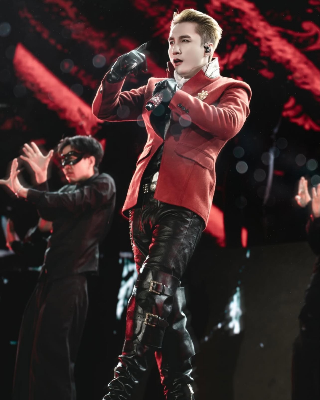 Nam ca sĩ diện áo khoác kiểu dáng quân đội màu đỏ burgundy của nhà mốt Pháp. Thiết kế được làm từ len và lụa cao cấp, với cổ dựng có thể lật lên để lộ lớp lót lông ngựa màu be, cùng phom dáng cứng cáp và túi nắp hai bên eo. Tất cả mang lại vẻ thanh lịch, thể hiện tinh thần haute couture đậm chất Dior.