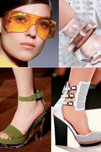 Mắt kính to, sắc cạnh, trang sức bằng chất liệu lucite trong suốt, giày, túi có bề mặt lưới hoặc phối những đường sọc dứt khoát song hành lý tưởng với những trang phục kiểu thể thao.