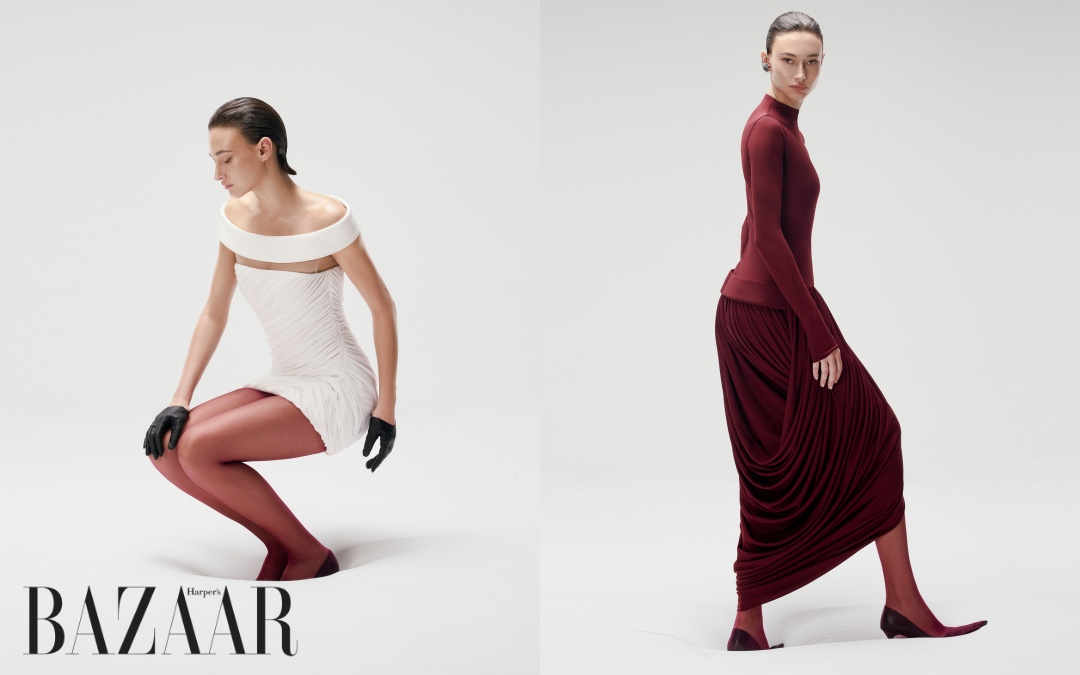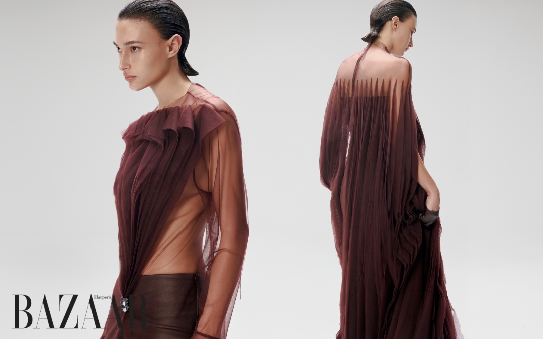 Chất liệu cũng là ngôn ngữ của “hợp thể”: tulle mong manh đối thoại cùng da chắc khỏe, satin bắt nhịp với twill, lông nâng đỡ hơi ấm của kim loại lạnh.