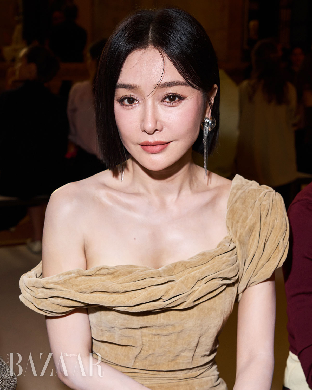 Tần Lam xuất hiện tại show diễn với tạo hình sang trọng và quyến rũ trong trang phục đến từ Look 37 trong BST Tory Burch Thu Đông 2025 – một thiết kế tiêu biểu cho tinh thần tối giản mà tinh tế của thương hiệu. Nữ diễn viên trong chiếc đầm này mang phong thái của một quý cô hiện đại nhưng có khí chất cổ điển đầy mê hoặc. Chiếc váy form dáng ôm sát tôn lên vóc dáng nuột nà của Tần Lam và chi tiết ruching ở eo và hông khéo léo tôn vinh đường cong cơ thể. Chất liệu vải da lộn mang lại chiều sâu thị giác qua từng nếp gấp.