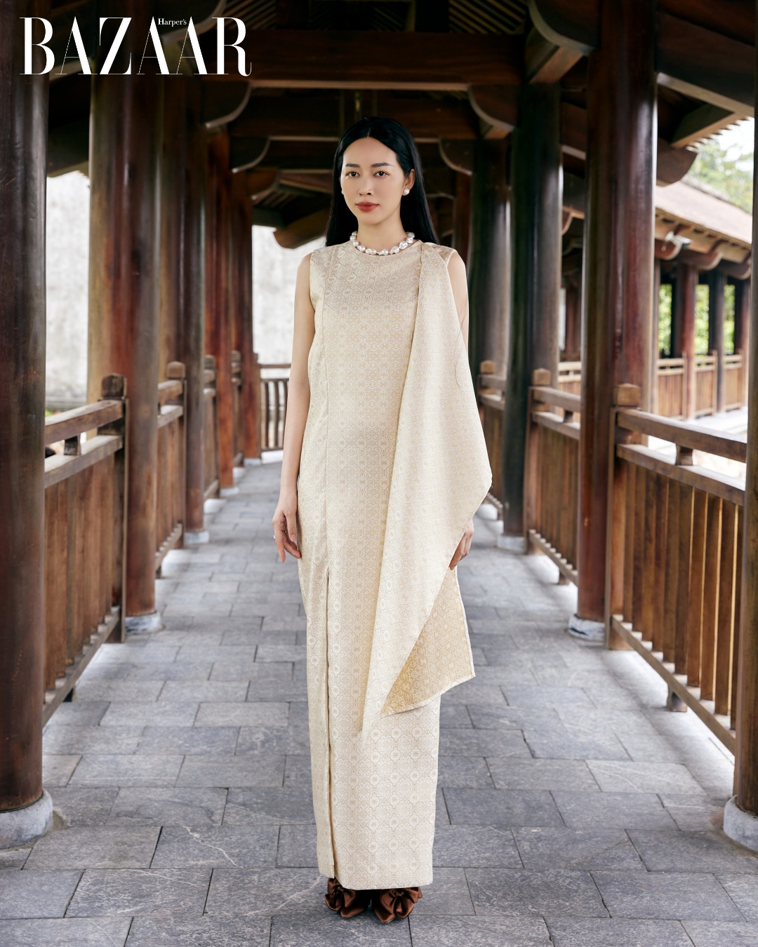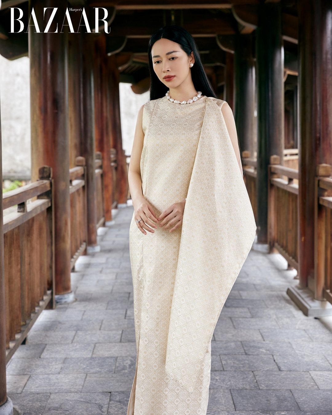 Áo dài Bạch Ngọc từ Gấm sa hạt tơ tằm với bề mặt ánh li ti, tạo chiều sâu thị giác. Kết hợp cùng lụa organza 100% tơ tằm, lớp chất liệu trong mờ mang đến hiệu ứng đa tầng mơ hồ giữa thực và ảo.