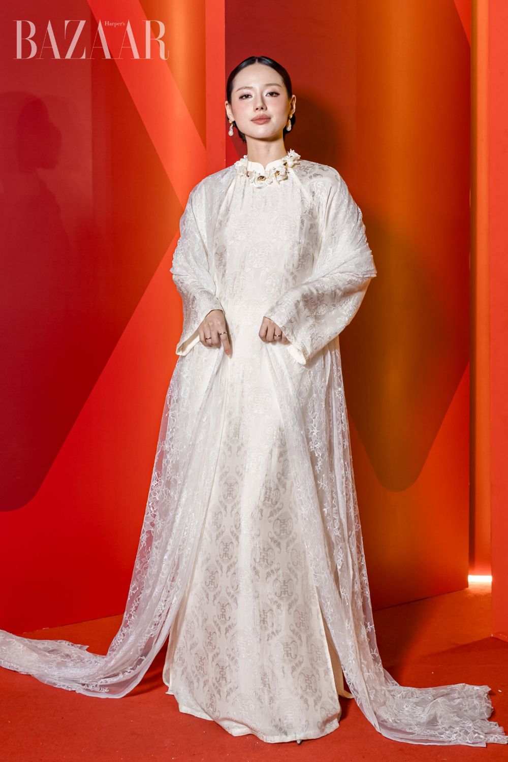 Dáng áo dài truyền thống ôm sát cơ thể trở nên lộng lẫy bội phần khi kết hợp với phần áo choàng thả dài phía sau. Sự kịch tính này gợi nhớ đến những chiếc váy khổng lồ từ những đại minh tinh khi họ mang đến phép màu cho các sự kiện danh giá.