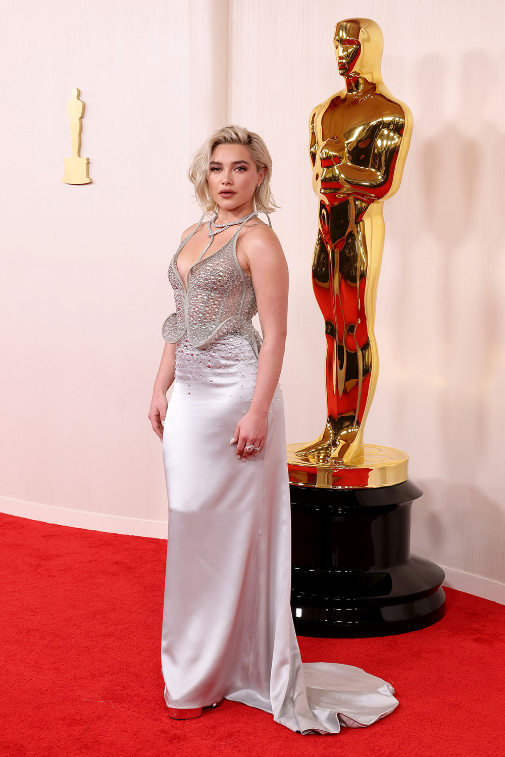 Florence Pugh tạo dáng trên thảm đỏ Oscar 2024 trong chiếc váy satin màu bạch kim với phần corset xuyên thấu. Cô hoàn thiện vẻ ngoài lộng lẫy với mái tóc cùng tông màu và dây chuyền kim cương lấp lánh.