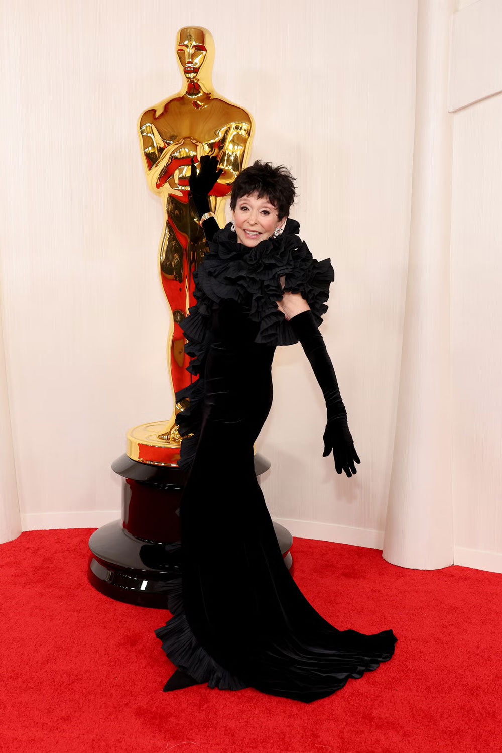 Có rất nhiều bộ váy đen tuyệt vời tại lễ trao giải Oscar năm nay, nhưng diện mạo của Rita Moreno là nổi bật nhất. Với chiếc váy Badgley Mischka tinh tế làm từ vải taffeta và vải nhung xếp ly, cùng điểm nhấn là phần voan phồng ở ngực, nữ diễn viên 92 tuổi đã đem lại visual bắt mắt cho thảm đỏ. Cô tô điểm cho vẻ ngoài với đôi găng tay opera đen và mái tóc pixie giả.