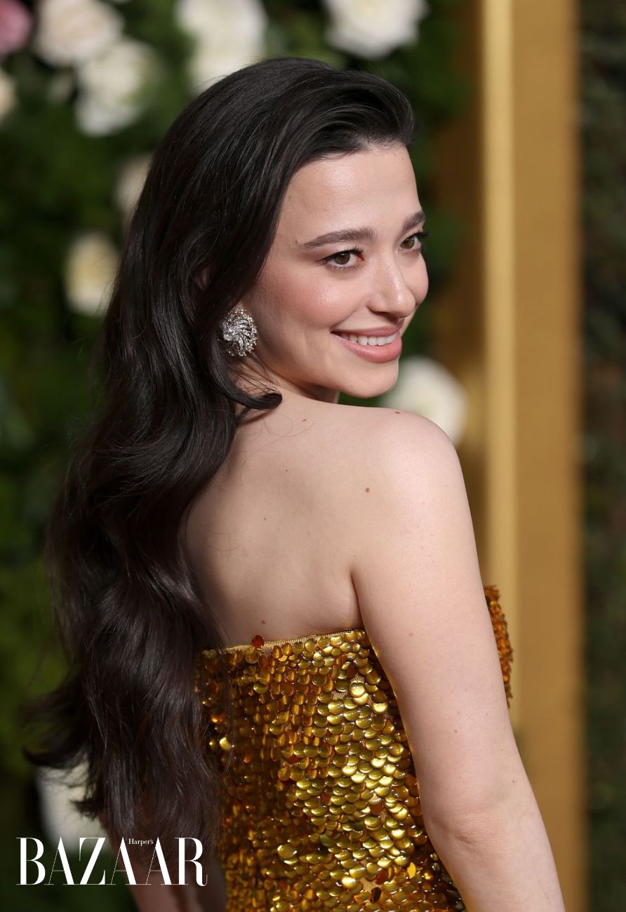 Một trong nhữg chiếc váy từ cựu giám đốc sáng tạo Matthiew Blazy trước khi anh đầu quân cho Chanel, chiếc váy áo quây được đính kết từ hàng miếng da màu vàng phản chiếu trông như vảy cá. Mikey Madison không đeo vòng cổ, thay vào đó chọn bộ bông tai và nhẫn từ bộ sưu tập đỉnh sức của Tiffany & Co.