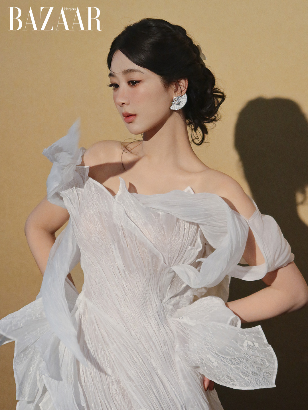 Lấy ví dụ sự kiện thương hiệu xe hơi Chery hôm 15/11/2025. Dương Tử xuất hiện trong thiết kế thuộc ARCH COUTURE. Trang phục màu trắng thanh lịch đắp nổi ren quanh cổ, tay áo, chân váy và túi áo.