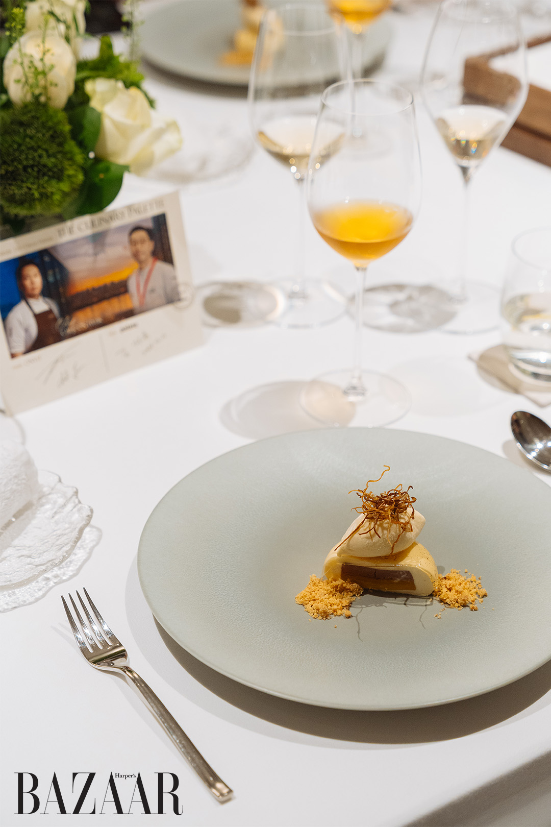 Sorbet quýt với bọt sữa chua và chanh trứng cá hồi mang lại sự tươi mới trước khi bước sang món tráng miệng cuối: burdock mousse cake cùng kem ngưu bàng sô cô la trắng. Ngưu bàng chiên tạo độ giòn thú vị, kết cấu mousse mịn màng.