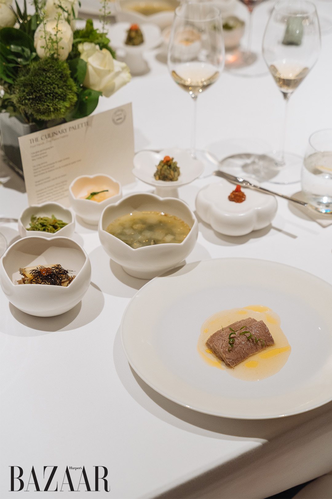 Tiếp đó là gầu bò Wagyu dùng cùng cơm Andong bào ngư, canh tảo maesaengi với vẹm và hàu, rau su su trộn doenjang, nabak kimchi và dưa chuột muối mentaiko xông khói. Một tổ hợp đậm đà hơn, nhưng vẫn giữ được sự tiết chế cần thiết trong fine dining.