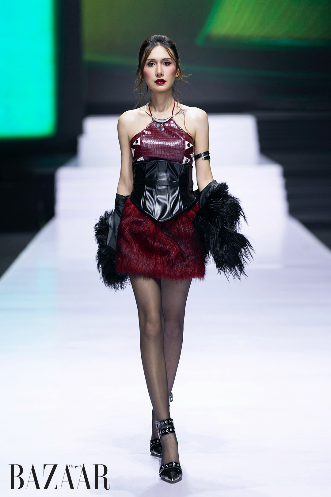 Lynk Lee xuất hiện đầy quyền lực, thiêu đốt sàn diễn với thiết kế corset da đỏ tía và chân váy lông vũ đen rực cháy của The Mad Lab