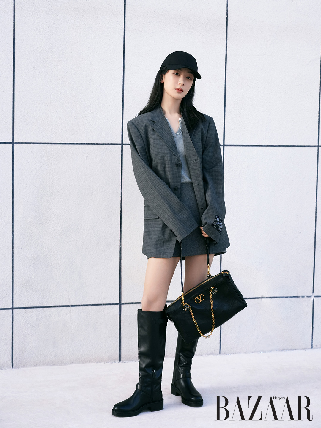 Cô cầm túi Panthea cỡ lớn, phần da mềm hơi nhăn tự nhiên, xích vàng rủ nhẹ, hòa vào dáng người đang chuyển động. Sự tương phản giữa họa tiết len dệt và bề mặt da bóng khiến tổng thể trở nên sinh động. Một người phụ nữ không khuôn mẫu biết tận hưởng chính mình và biết cách khiến thời trang trở thành ngôn ngữ riêng.