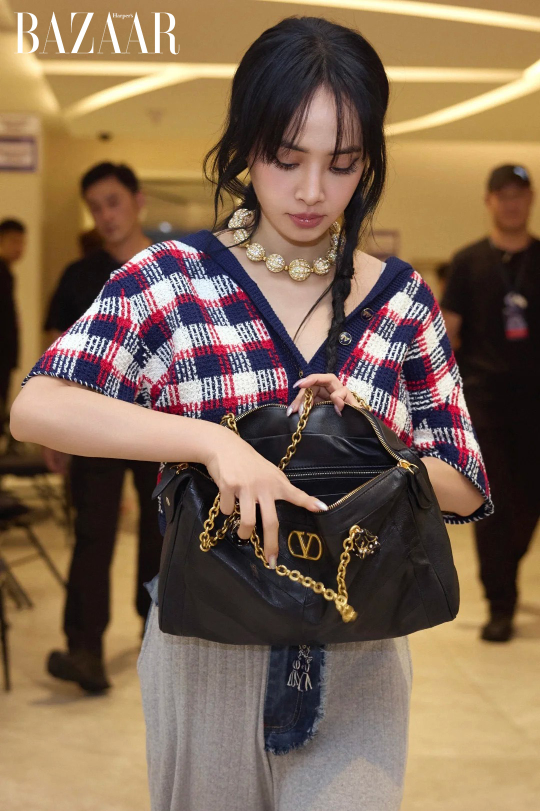 Khác với Tôn Lệ và Dương Tử, Thái Y Lâm mang theo tinh thần của một nghệ sĩ đương đại, vừa tinh nghịch, vừa gợi cảm. Cô diện áo len caro đỏ, trắng, xanh dáng lửng, kết hợp quần ống rộng xám nhạt, phong cách phóng khoáng, thoải mái nhưng vẫn đầy chủ ý. Chuỗi vòng cổ to bản làm sáng gương mặt và tăng thêm nét retro quý phái.