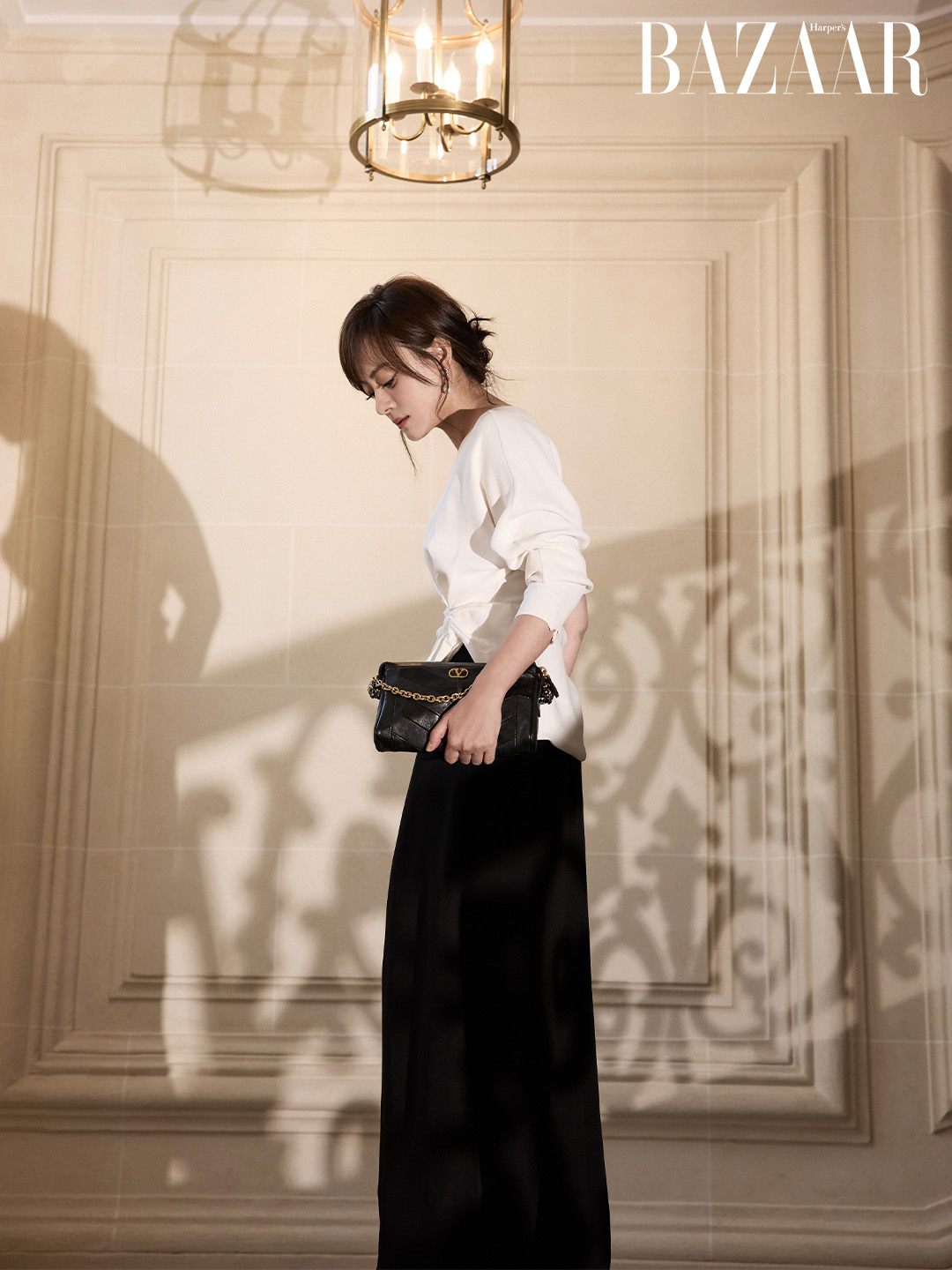 Trong thiết kế đầm hai sắc trắng đen tối giản, Tôn Lệ hóa thân thành hình mẫu của sự điềm tĩnh và tự tin. Tương phản với trang phục trắng đen cổ điển là chiếc túi Valentino Panthea đen với dây xích vàng, có gì đó gai góc mà vẫn mềm mại. Không cần thêm nhiều phụ kiện cầu kỳ, chỉ bằng thần thái và bố cục tinh giản, Tôn Lệ gợi nên hình ảnh một nữ nhân hiện đại, từng trải, bình lặng nhưng đầy sức hút.
