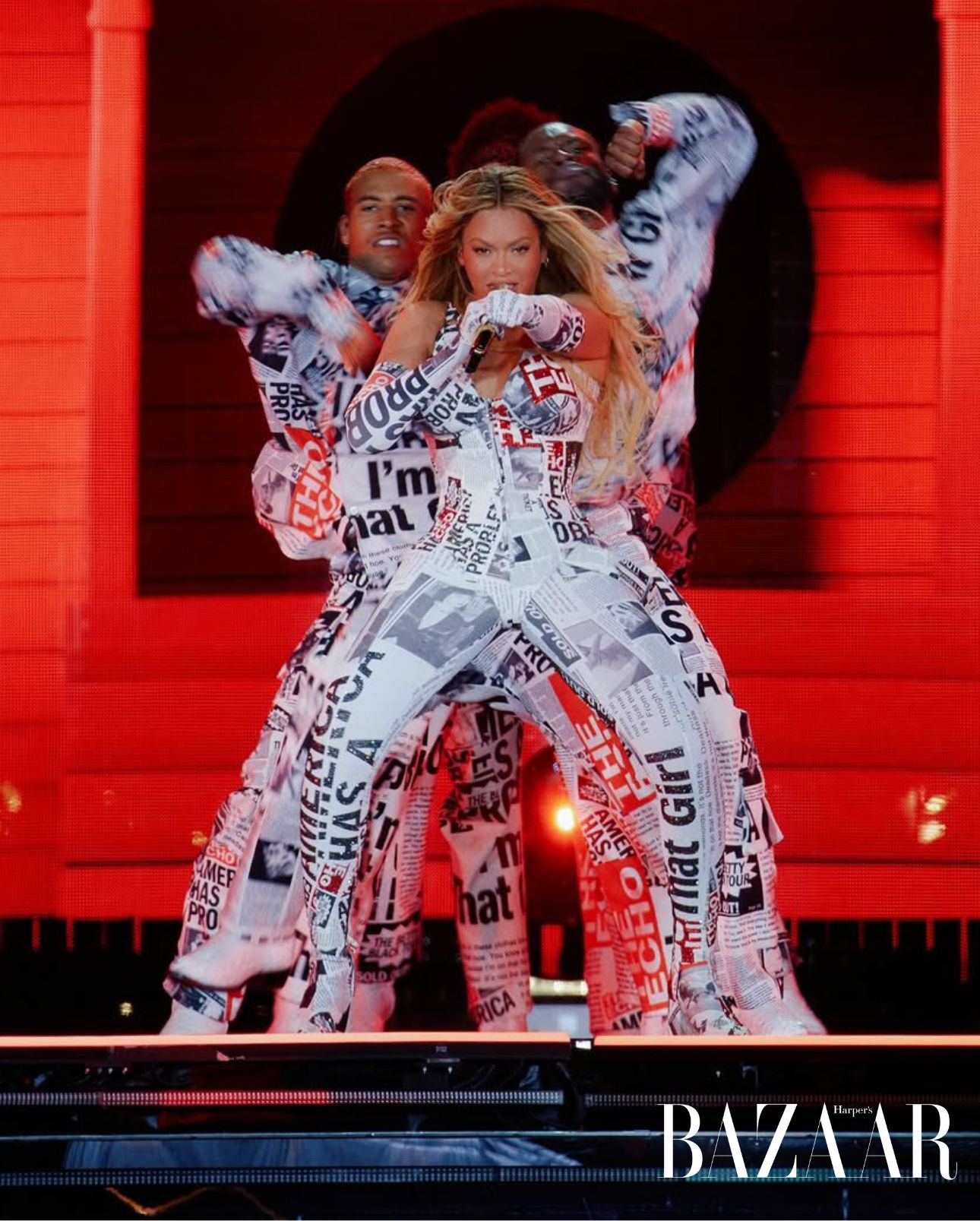 Để thể hiện tinh thần kể trên, Beyoncé lựa chọn diện một bộ bodysuit mang họa tiết giấy báo do Diesel thiết kế vừa như một lời nhắc về vai trò của truyền thông, vừa như một tuyên ngôn thời trang đầy ẩn ý.