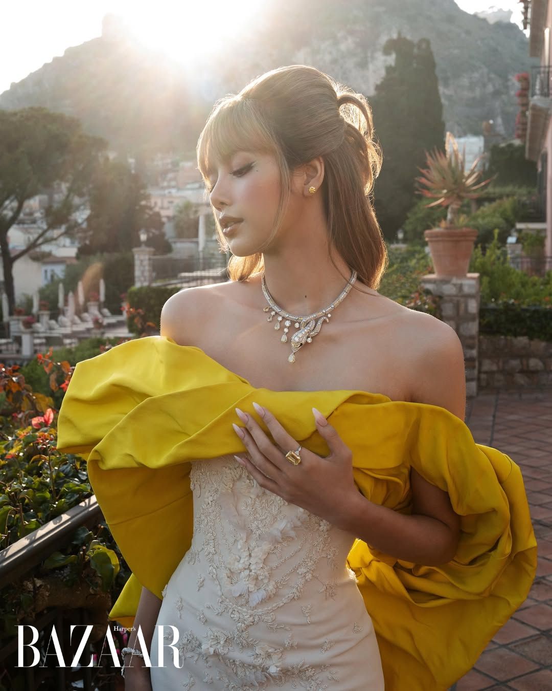 Lisa đại diện cho hào quang rực sắc từ BST Polychroma với vòng cổ Serpenti Sunburst nạm viên kim cương vàng, một sắc màu rực rỡ trong quang phổ kim cương màu fancy. Sắc vàng là hệ quả của quá trình hình thành kim cương có sự hiện diện của nguyên tử nitơ. Độ đậm viên đá tỷ lệ thuận với giá trị.