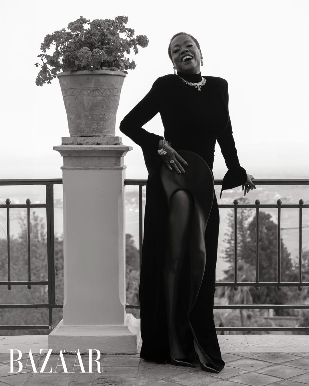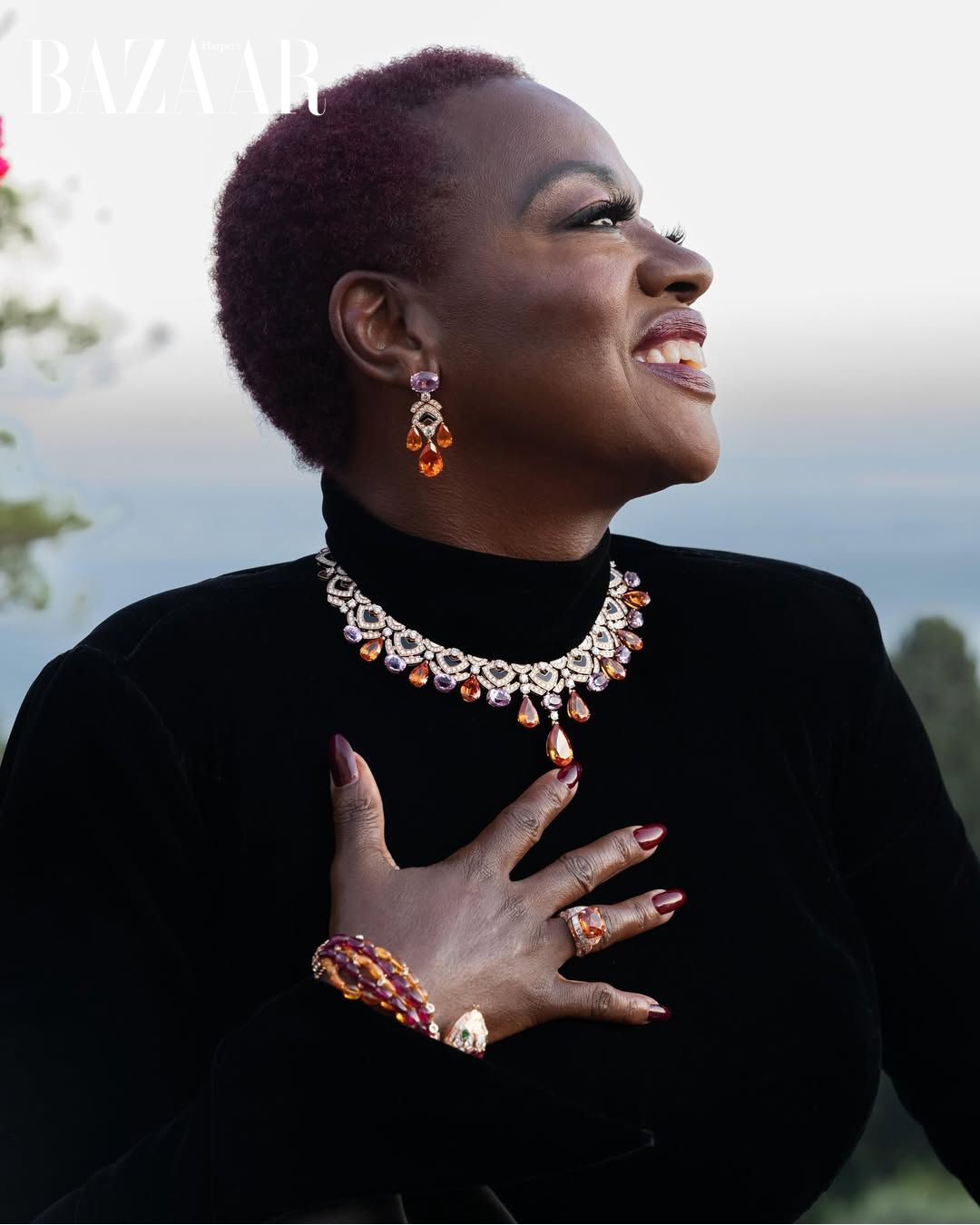 Váy cổ lọ đen giúp tôn lên hoàn hảo từng đường nét sắc sảo của món trang sức. Phần ống tay loe của váy và mái tóc ngắn của Viola tiết lộ những tuyệt tác trang sức ánh cam khác sánh đôi cùng Viola: Nhẫn, hoa tai, vòng tay.