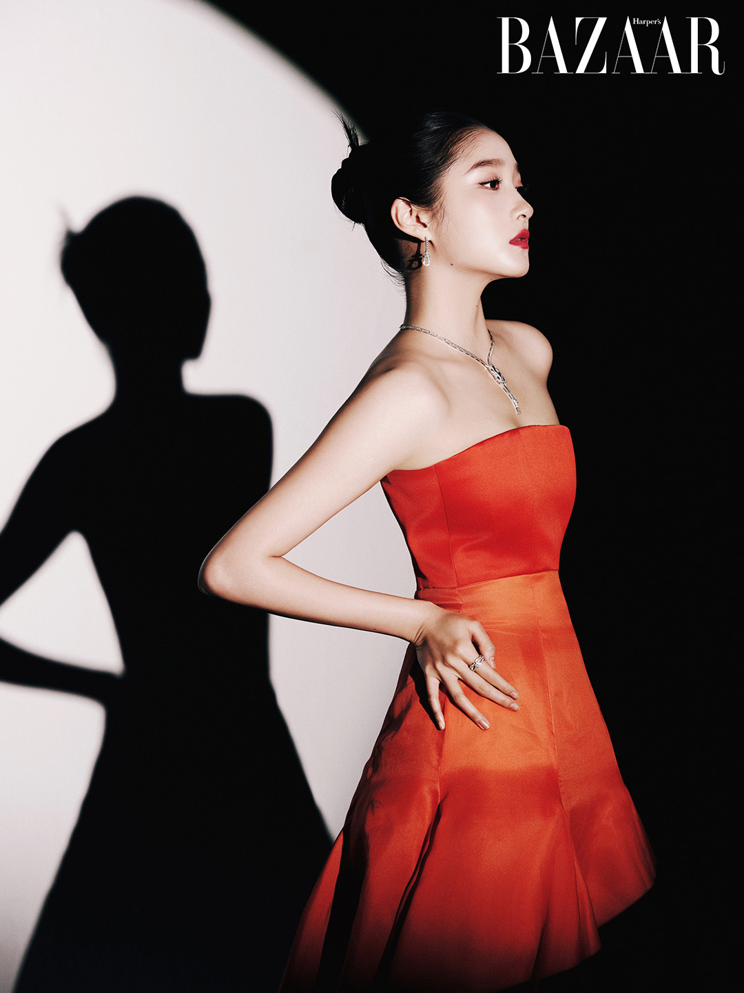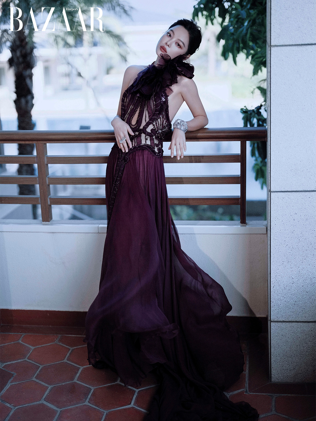 Hoàn tất diện mạo, cô chọn trang sức kim cương từ Fred. Sự tương phản giữa màu sắc mạnh mẽ và mềm mại cho thấy cách nghệ sĩ chơi màu như một cuộc đối thoại với ánh sáng, trang sức và thần thái.