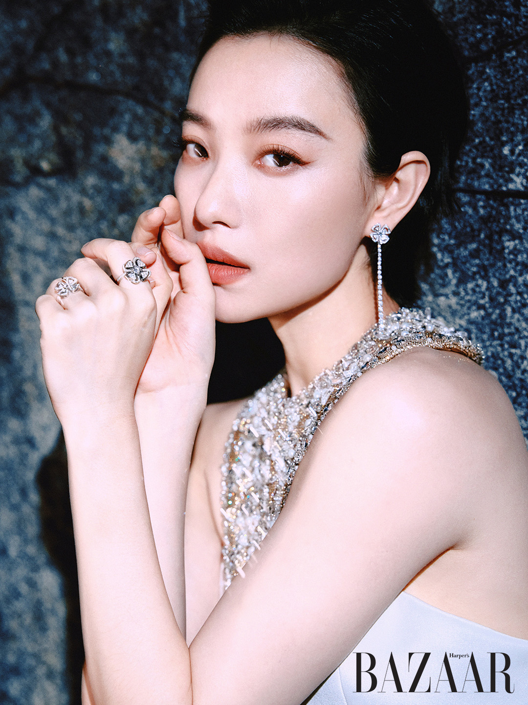 Thiện Y Thuần kết hợp nhiều vòng tay, nhẫn và dây chuyền Chanel, tạo nhịp điệu ánh sáng theo từng bước chân. Quan Hiểu Đồng kết hợp Fred và Omega, vừa đại diện cho hai thương hiệu xa xỉ, vừa tôn vẻ sang trọng, quyền lực. Trong khi đó Nghê Ni (ảnh trên) chọn trang sức BVLGARI dát đầy kim cương ton-sur-ton với chiếc váy đính đá lấp lánh Sabina Bilenko Couture Xuân Hè 2025.