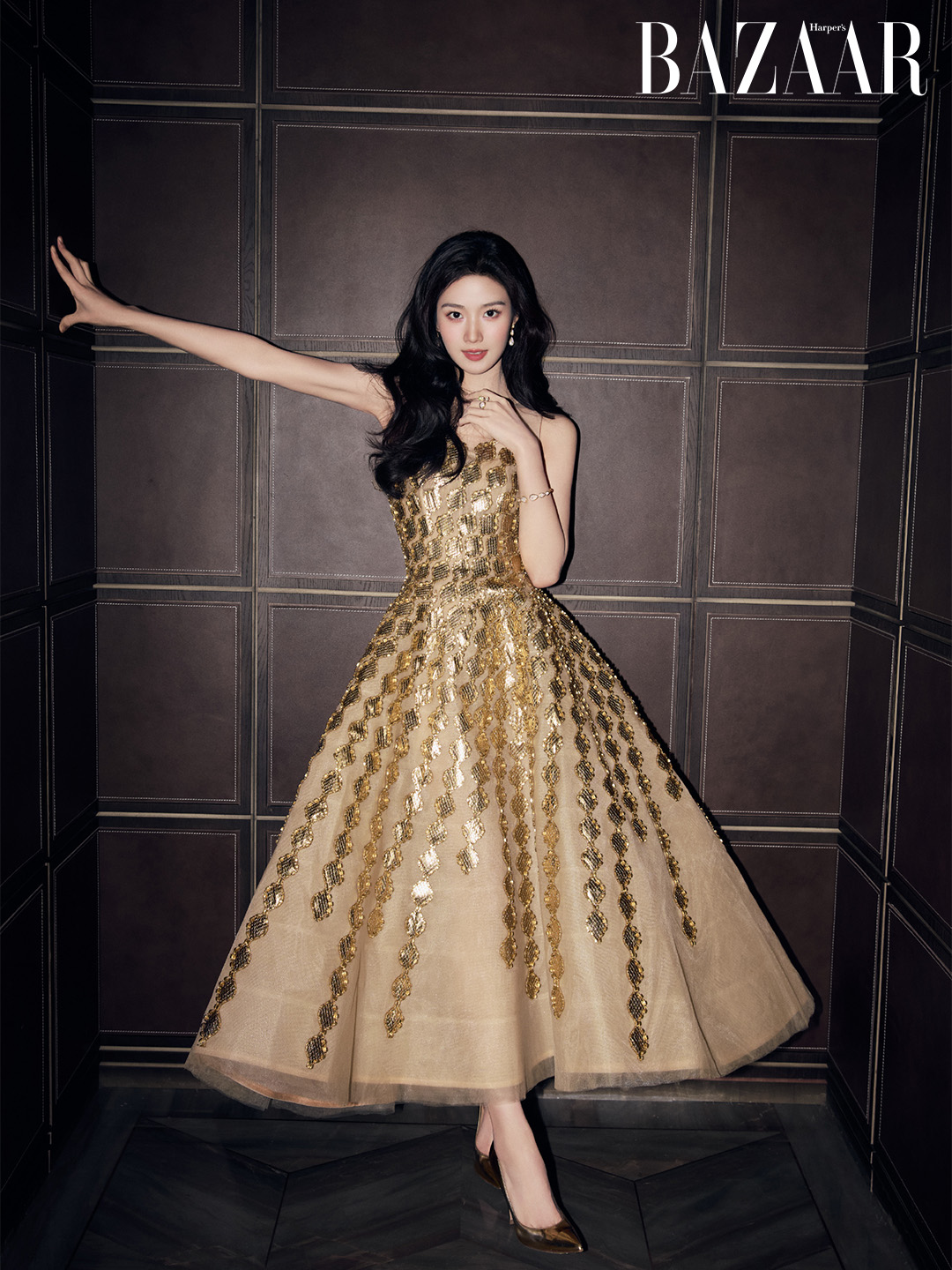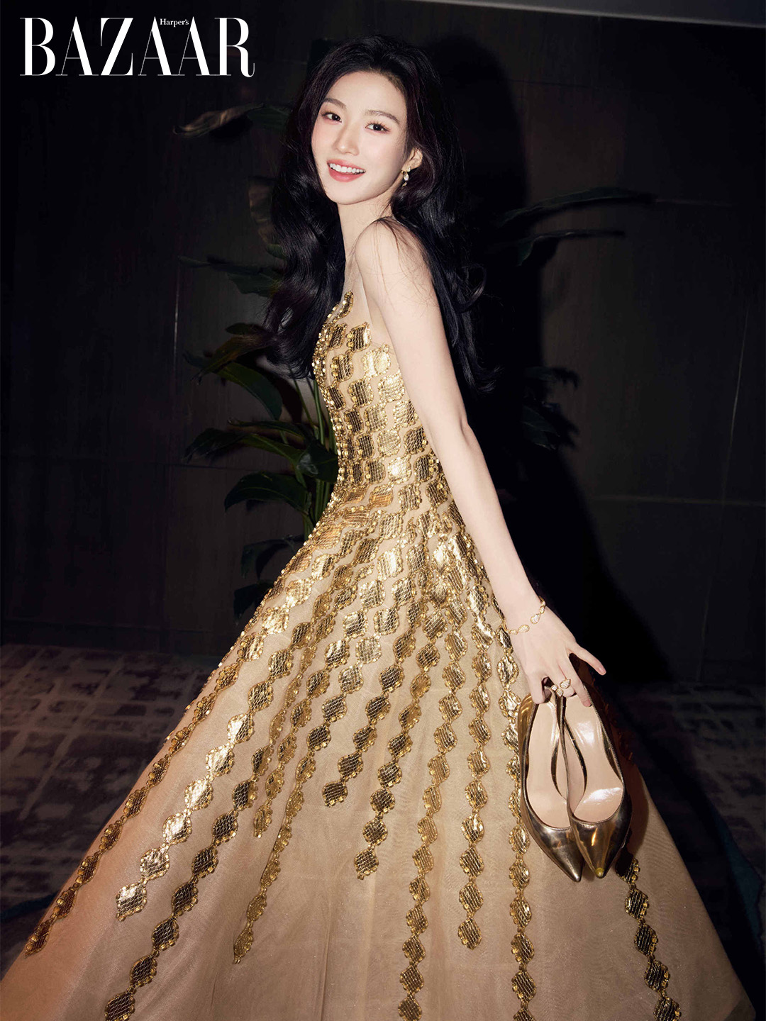 Trong lần hợp tác này, cô chọn chiếc váy quây form dáng ball gown truyền thống. Form dáng thật sự biến nữ diễn viên thành một công chúa. Phần thân váy ôm gọn vòng eo, từ đó mở rộng thành tán váy tròn đều, giúp tổng thể đạt được sự cân đối giữa tính điêu khắc và chuyển động. Bề mặt trang phục được phủ kín các dải đính kết ánh kim chạy dọc từ thân trên xuống chân váy, giống như những tia sáng lan tỏa trên nền vải mờ ảo.